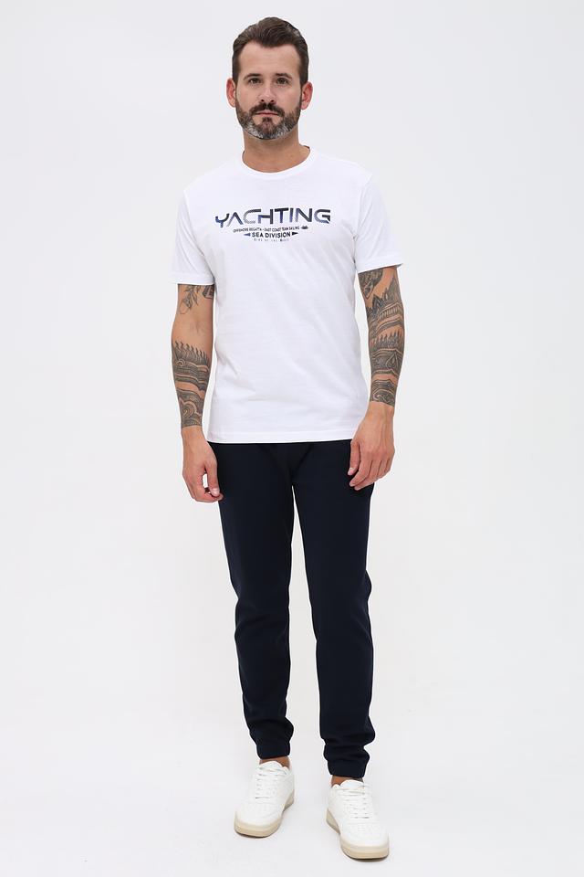 Основным элементом дизайна является крупный принт "Yachting" на передней части футболки, выполненный в сине-серых тонах. Принт добавляет образу динамичности и спортивного стиля.