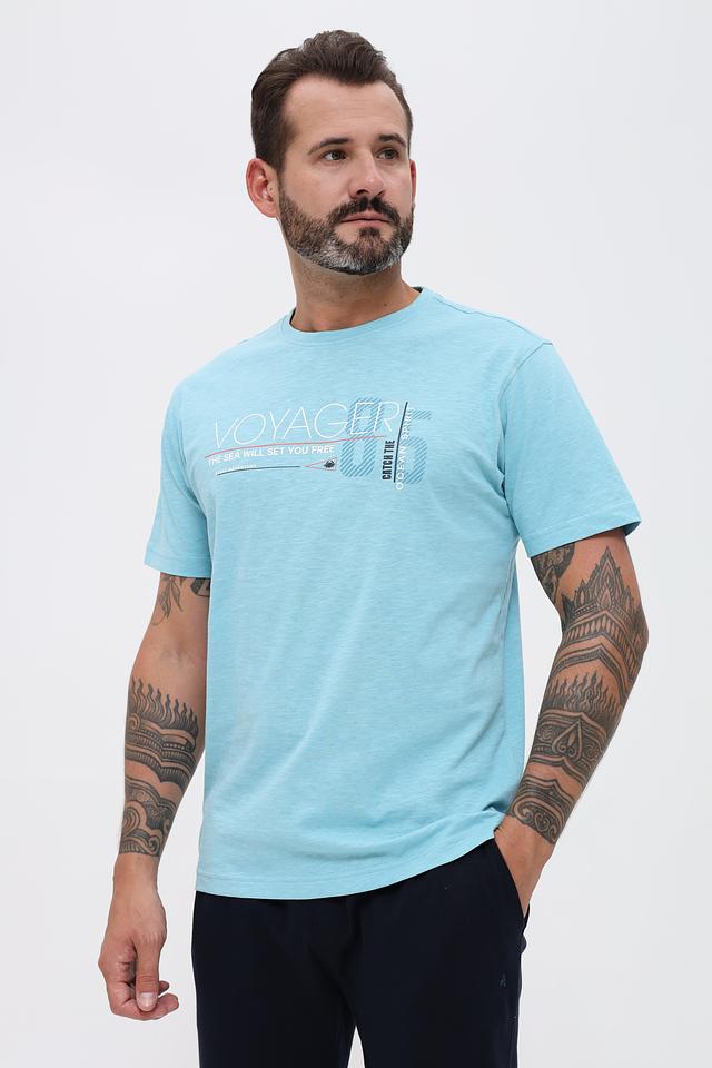 Футболка имеет голубой цвет и украшена ярким принтом "Voyager", который добавляет ей индивидуальности. Прямой крой обеспечивает свободу движений, а короткий рукав делает ее идеальной для теплой погоды.