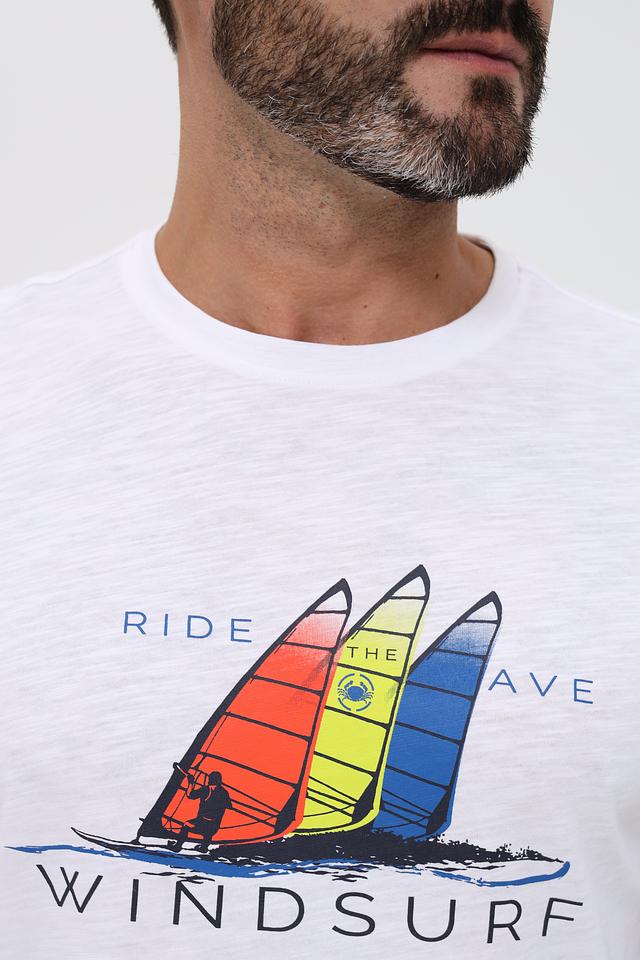На футболке расположен яркий и привлекательный принт с изображением виндсерфинга, выполненный в насыщенных цветах: красном, жёлтом, синем и оранжевом. Принт добавляет динамичности и оригинальности образу.