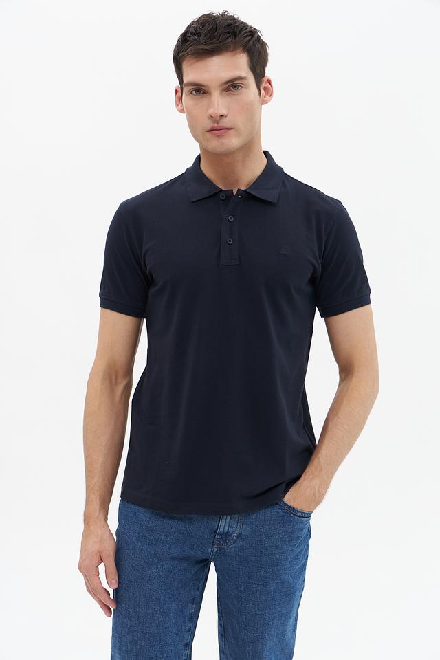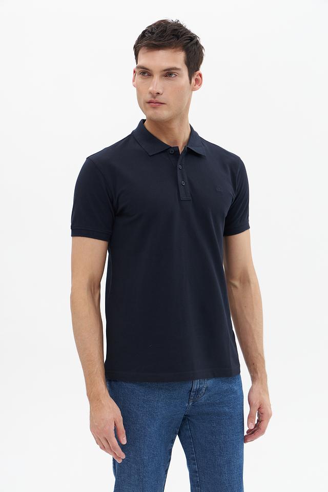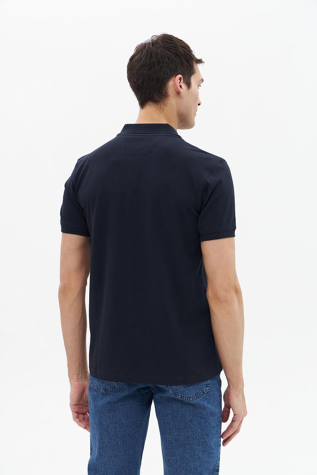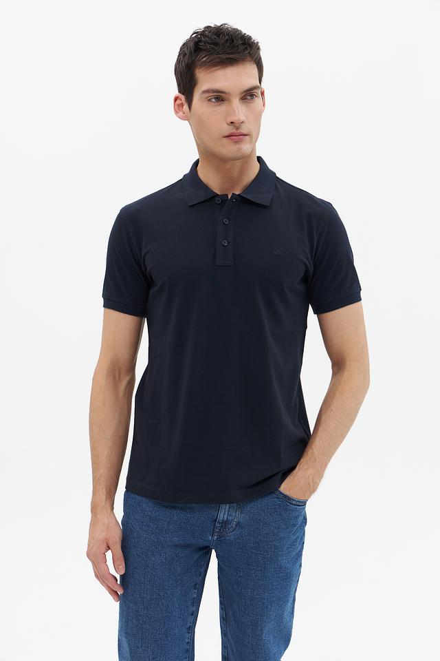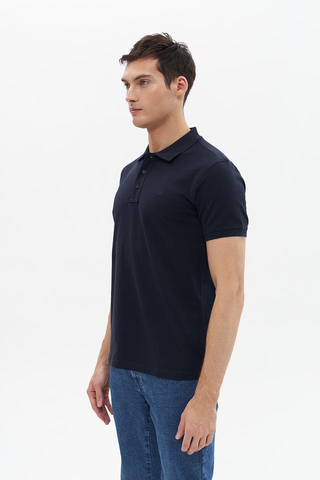 Поло имеет тёмно-синий цвет, который легко сочетается с различными элементами гардероба. Воротник и планка с тремя пуговицами выполнены в тон основной ткани. На груди расположен небольшой логотип бренда, добавляющий изделию узнаваемость.