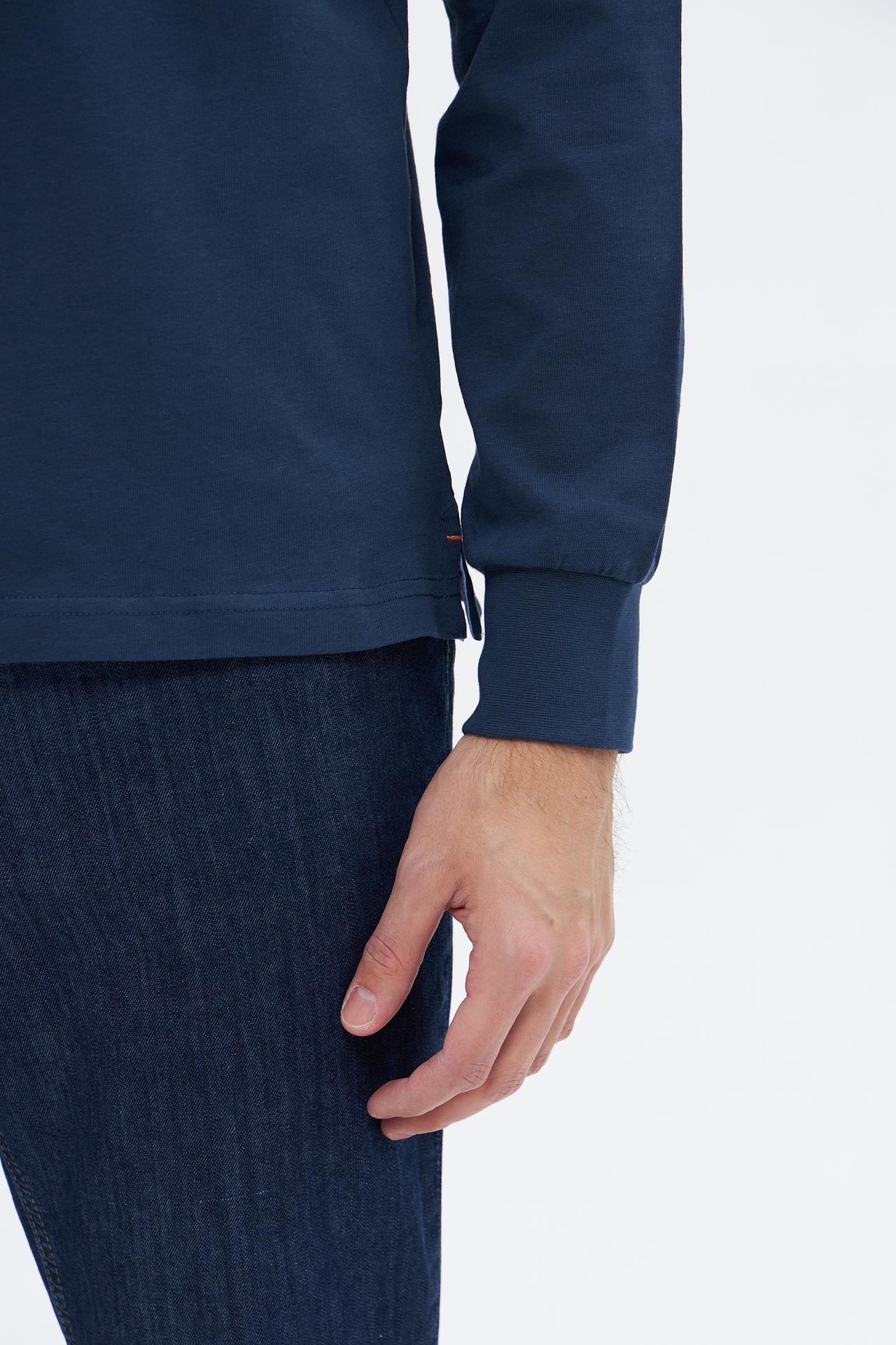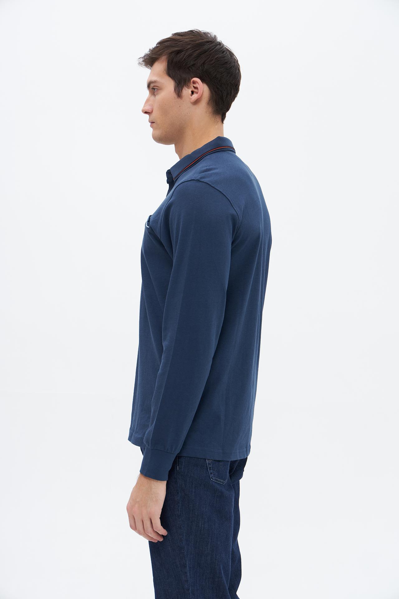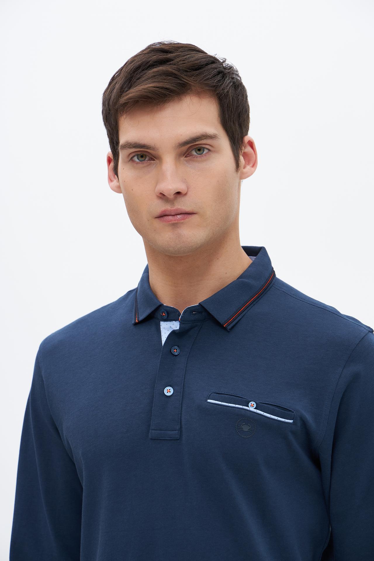 - Элегантный дизайн: Синее поло с длинным рукавом дополнено контрастной отделкой воротника, нагрудным карманом с декоративной окантовкой и светлыми пуговицами, создавая сдержанный и стильный образ.