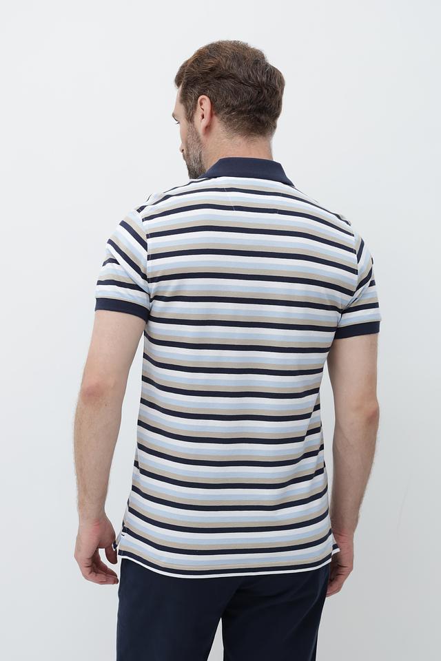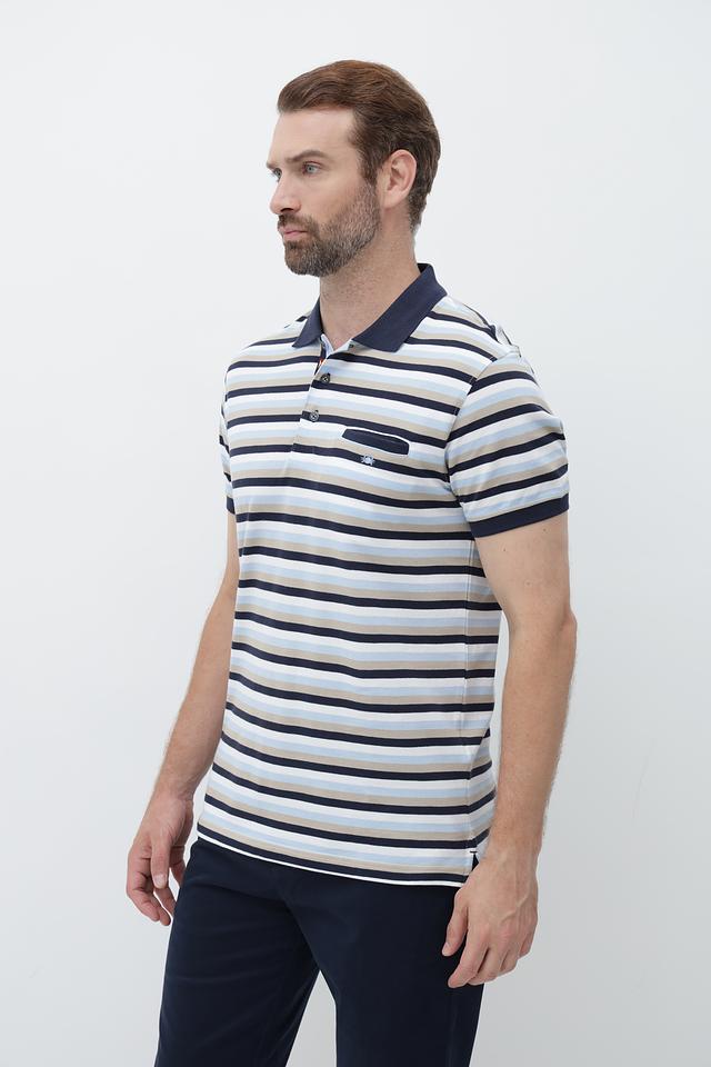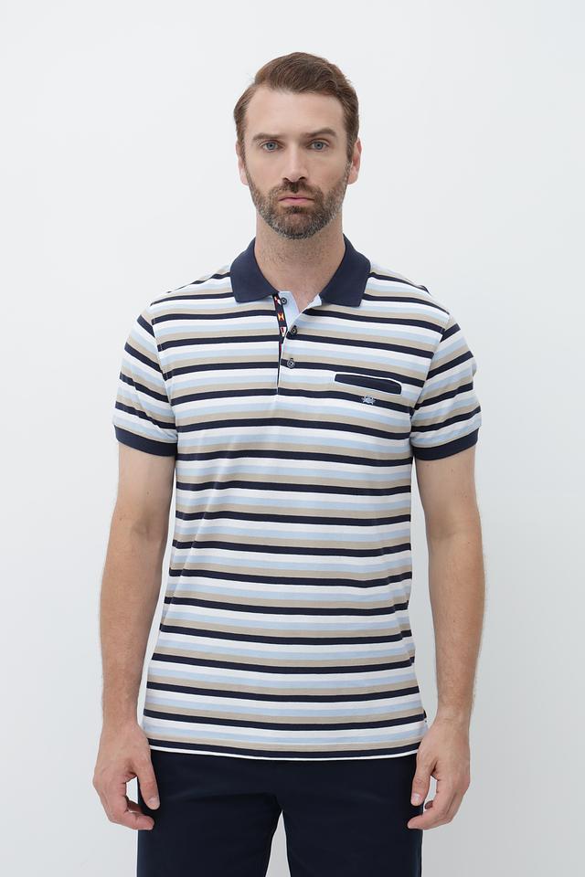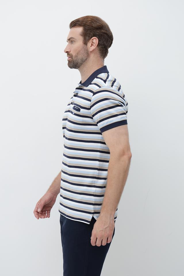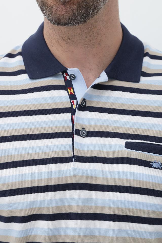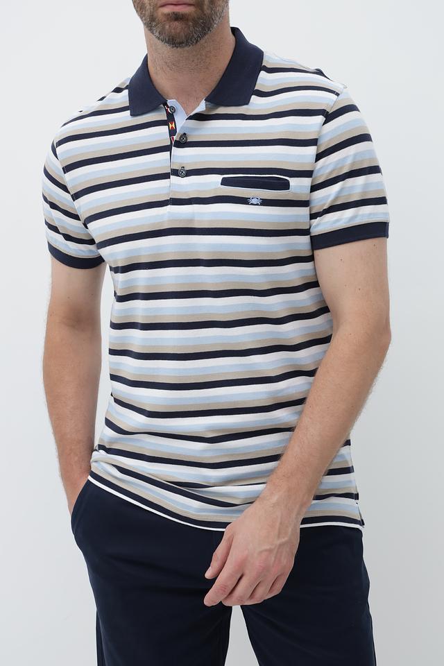Мужское поло от Granchio – это стильное и практичное решение для создания повседневного образа. Модель выполнена в горизонтальную полоску, сочетающую оттенки синего, бежевого и белого, что придает ей универсальность.