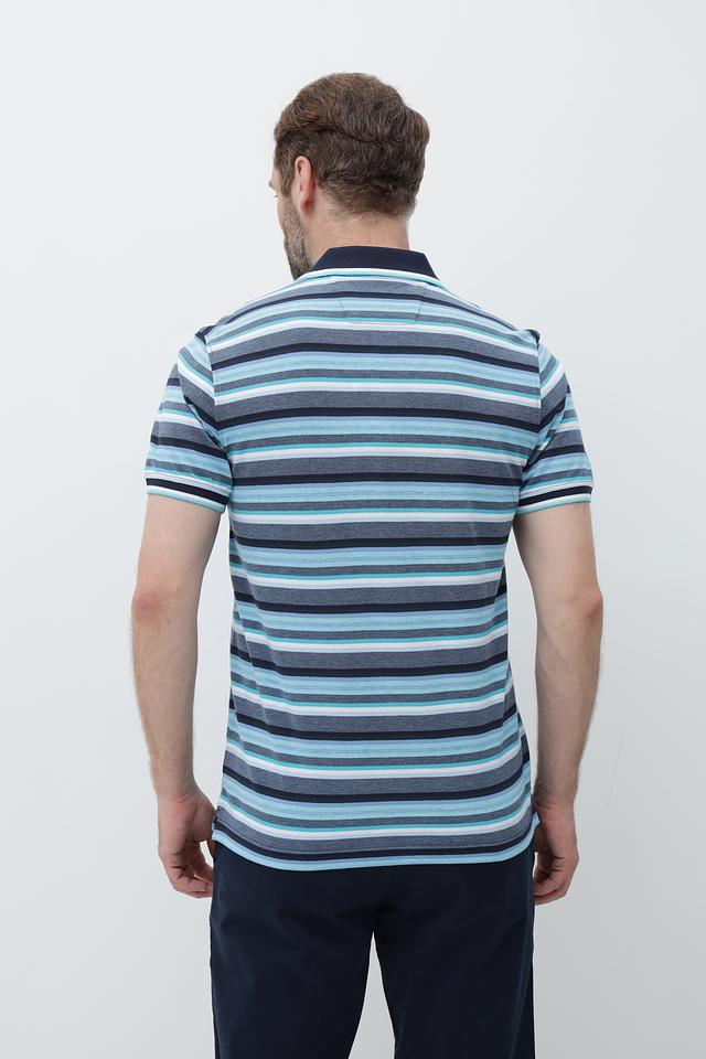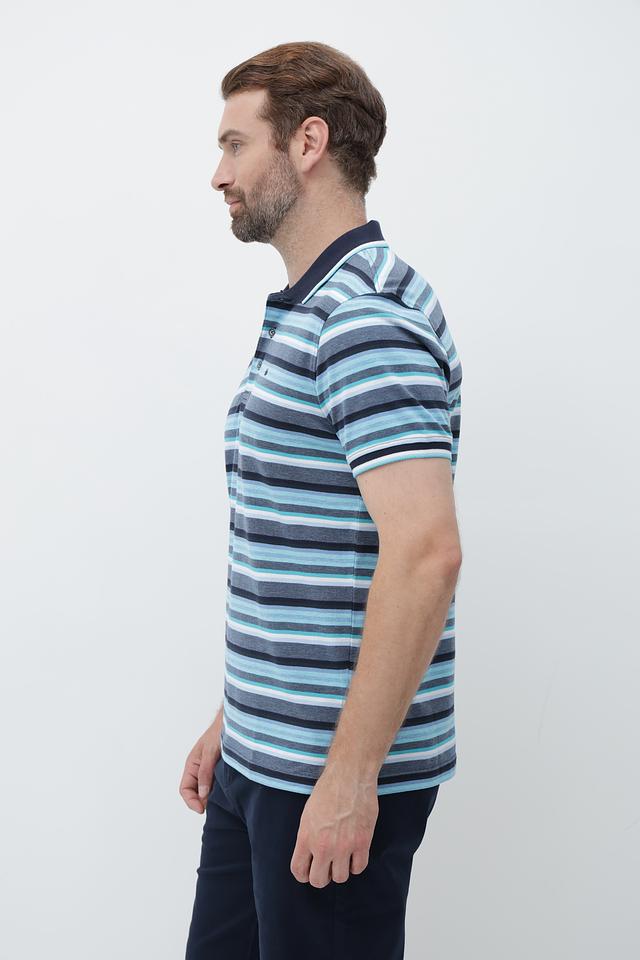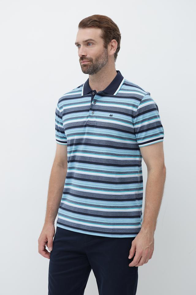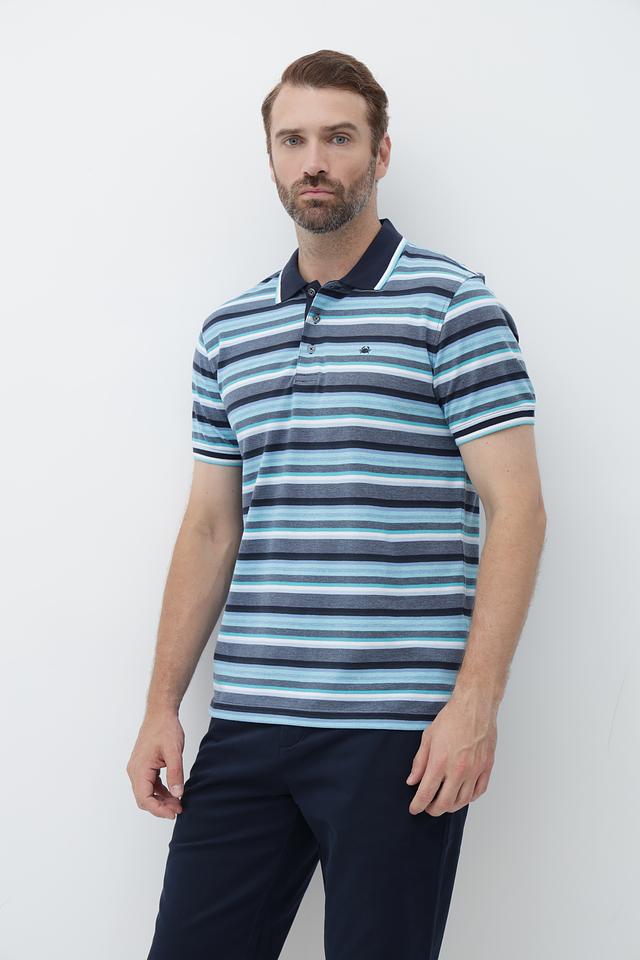 Это мужское поло от бренда Granchio выполнено в классическом крое с короткими рукавами. Основной цвет поло – синий, дополненный ярким полосатым рисунком в голубых, серых и белых тонах.
