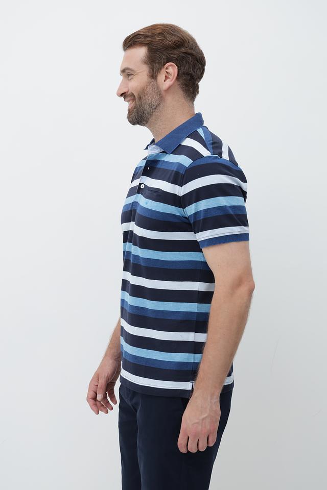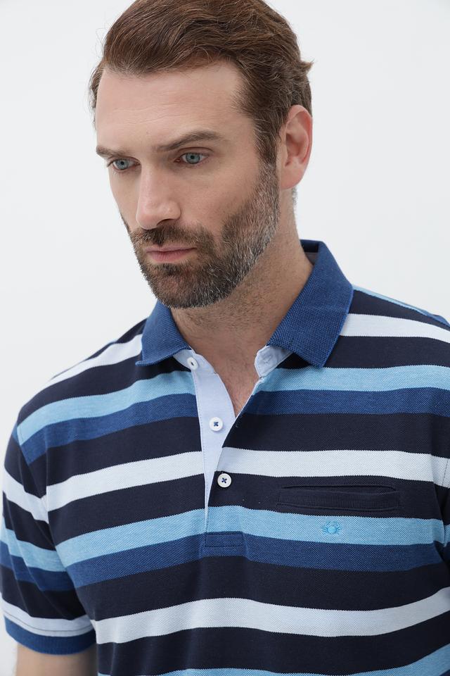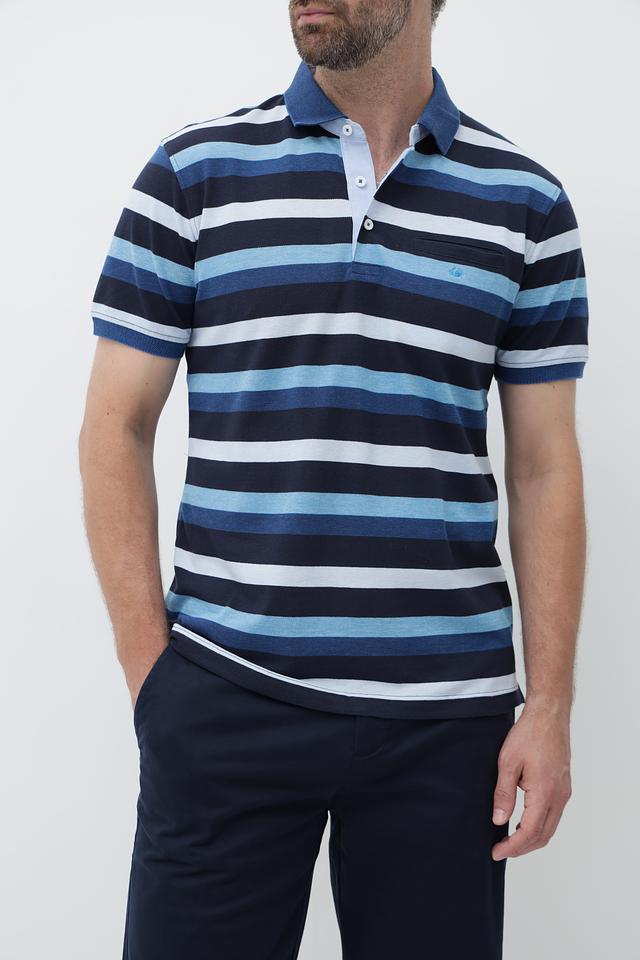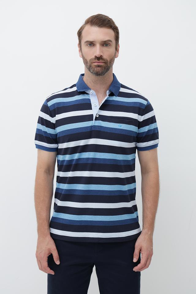 Мужское поло от бренда Granchio выполнено в классическом стиле с ярким дизайном в полоску. Основной цвет – синий, дополненный белыми и светло-голубыми полосами, создающими динамичный и свежий образ.
