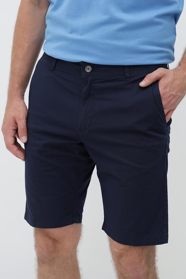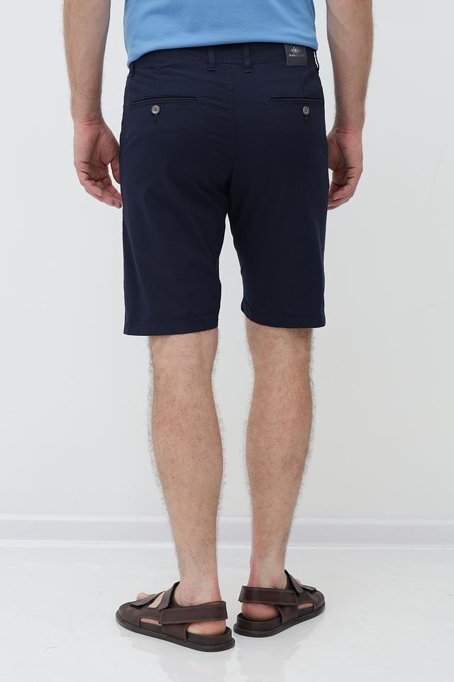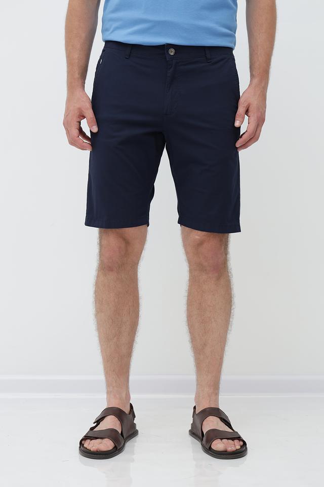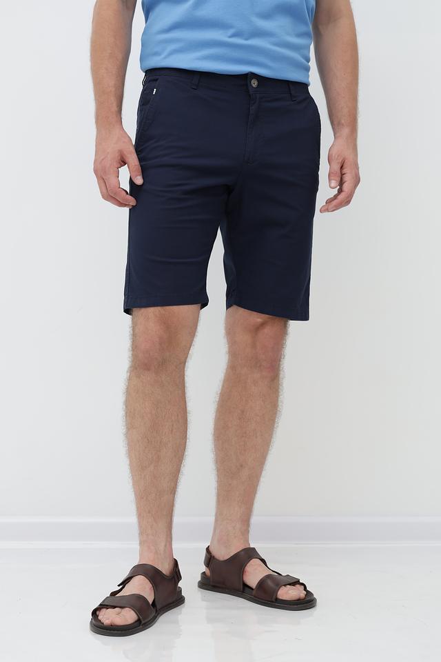 Цвет шорт – насыщенный темно-синий, который легко сочетается с различными элементами гардероба. Модель оснащена стандартным поясом с петлями для ремня и двумя боковыми карманами. Застежка – молния и пуговица. Задние карманы втачные, без клапанов.