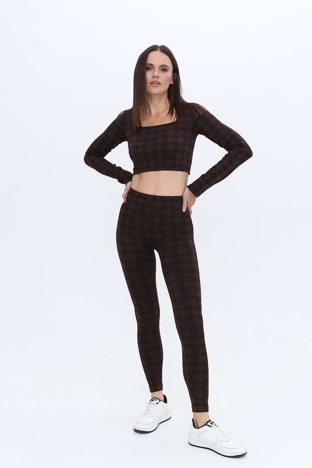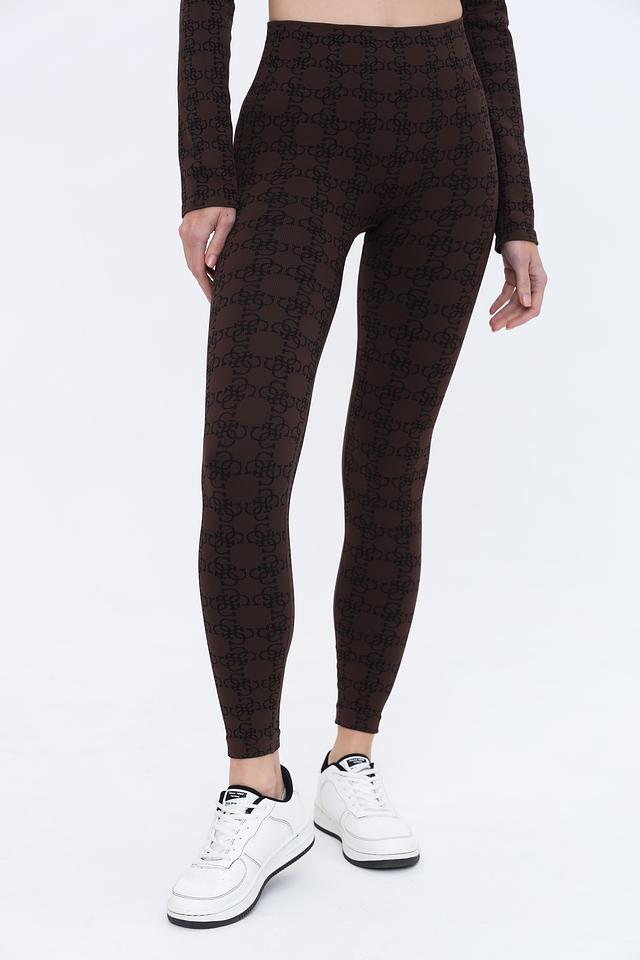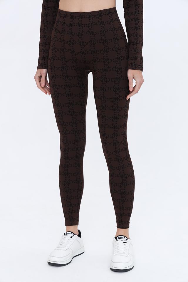 Женские леггинсы Guess коричневого цвета с фирменным логотипом по всей поверхности. Модель выполнена из эластичного материала, обеспечивающего комфортную посадку и свободу движений. Состав: полиэстер 48%, полиамид 44%, эластан 8%