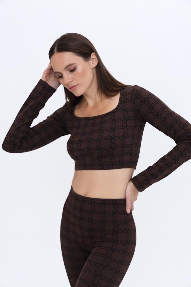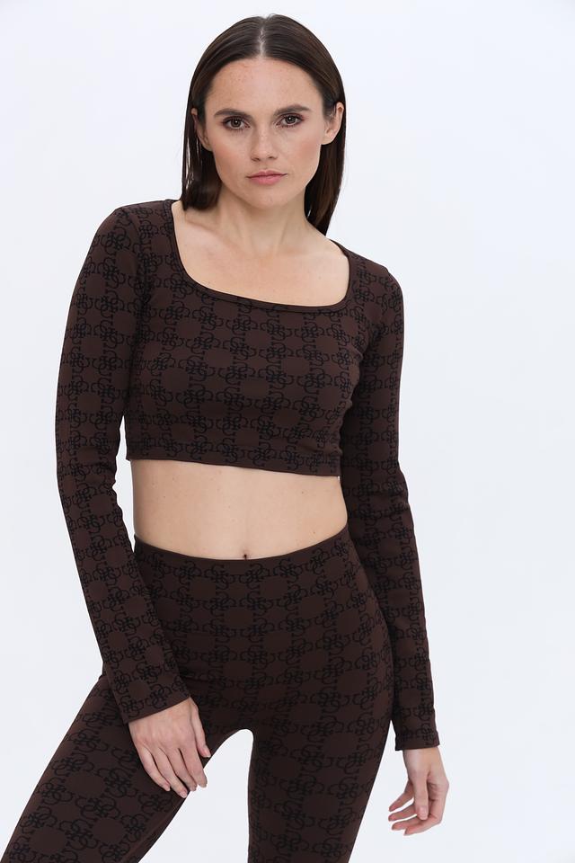Топ имеет короткий крой и длинные рукава, выполнен из полупрозрачной ткани с фирменным логотипом бренда по всей поверхности. Квадратный вырез горловины добавляет изысканности.