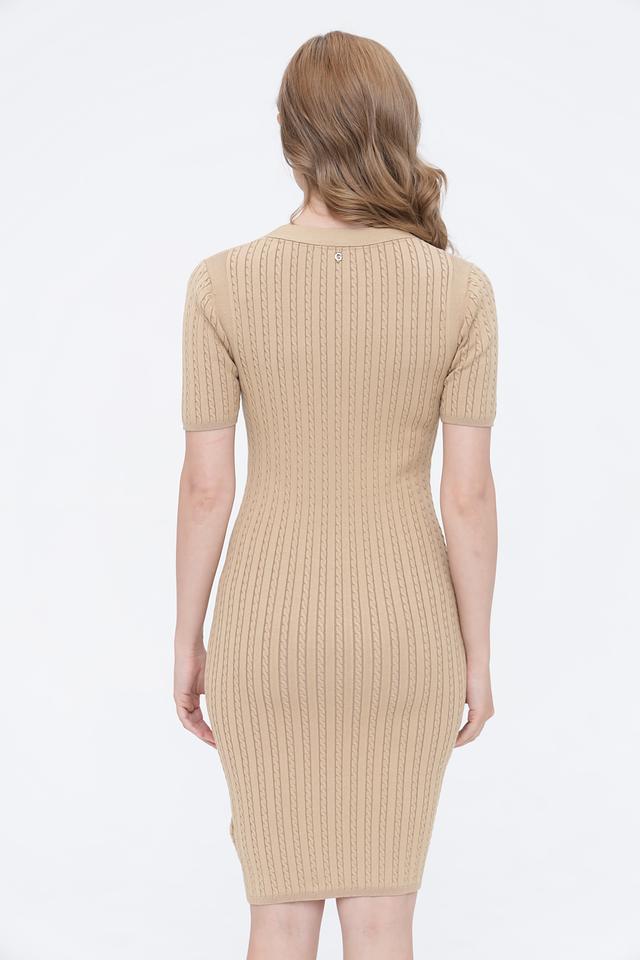 Текстура вязаного полотна с вертикальными полосками создает визуальный эффект стройности. Бежевый цвет платья универсален и легко сочетается с различными аксессуарами и обувью. Это платье станет отличным выбором для создания стильного и комфортного образа на каждый день или для особого случая.