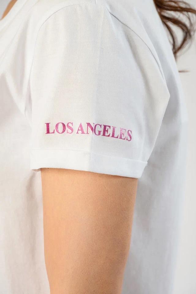 На левом рукаве расположена надпись "Los Angeles", добавляющая футболке особый шарм и индивидуальность. Круглый вырез горловины и короткие рукава обеспечивают комфортную посадку.