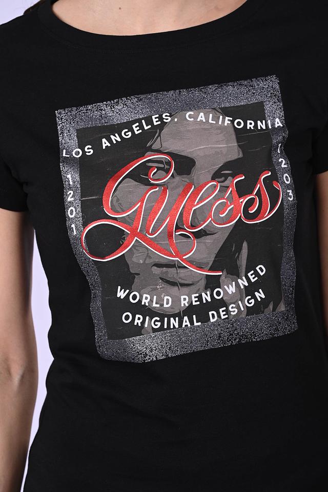 Чёрная футболка Guess с оригинальным принтом в стиле casual. Изготовлена из 100% хлопка, обеспечивающего комфорт и воздухопроницаемость. Стильный образ для повседневной носки. Состав: хлопок 100%