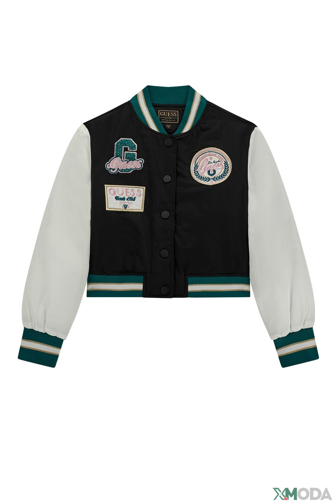 Куртка украшена контрастными рукавами и яркими нашивками с фирменной символикой, добавляющими уникальности. На спине красуется вышивка "Guess Club Beverly Hills", подчеркивающая индивидуальность.