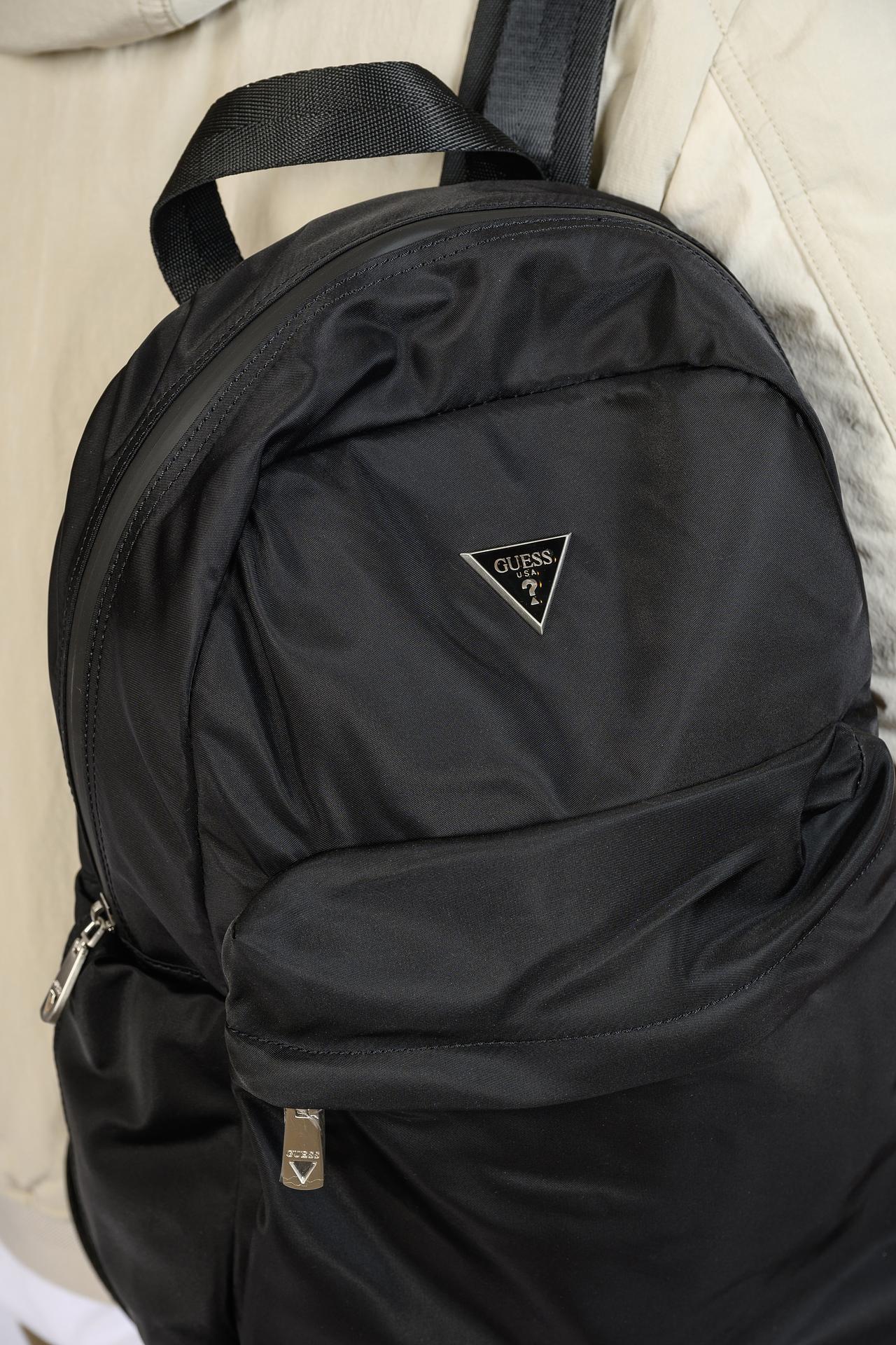 - Дизайн: Классический черный цвет и лаконичный крой делают этот рюкзак универсальным аксессуаром. Металлический логотип Guess в виде треугольника служит элегантным акцентом.