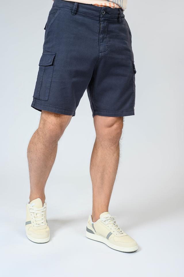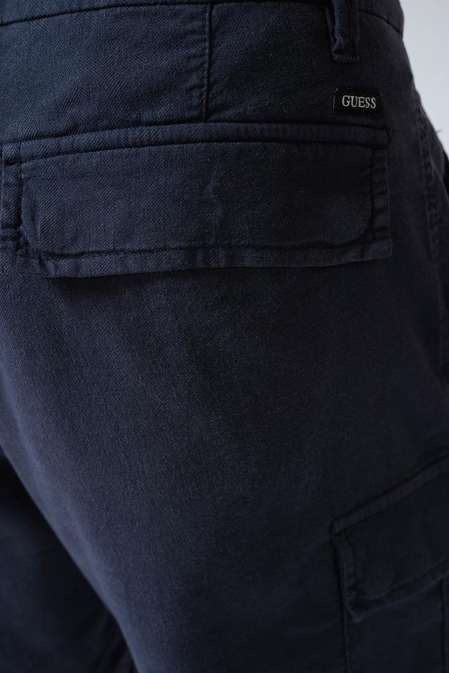 Мужские шорты Guess синего цвета – удобная и стильная модель в стиле карго. Изготовлены из хлопка с добавлением льна и эластана, обеспечивающих комфорт и свободу движений. Состав: хлопок 67%, лен 31%, эластан 2%
