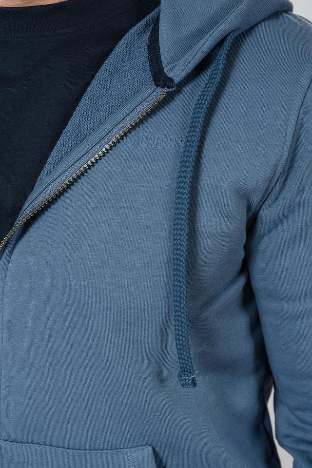 Мужская толстовка от бренда Guess выполнена в спокойном синем цвете. Модель оснащена удобной молнией во всю длину и капюшоном с регулируемыми шнурками.