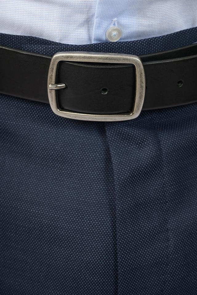 Ремень имеет классический чёрный цвет, который легко сочетается с различными стилями одежды – от делового костюма до повседневного образа. Пряжка выполнена из металла и имеет лаконичный дизайн.