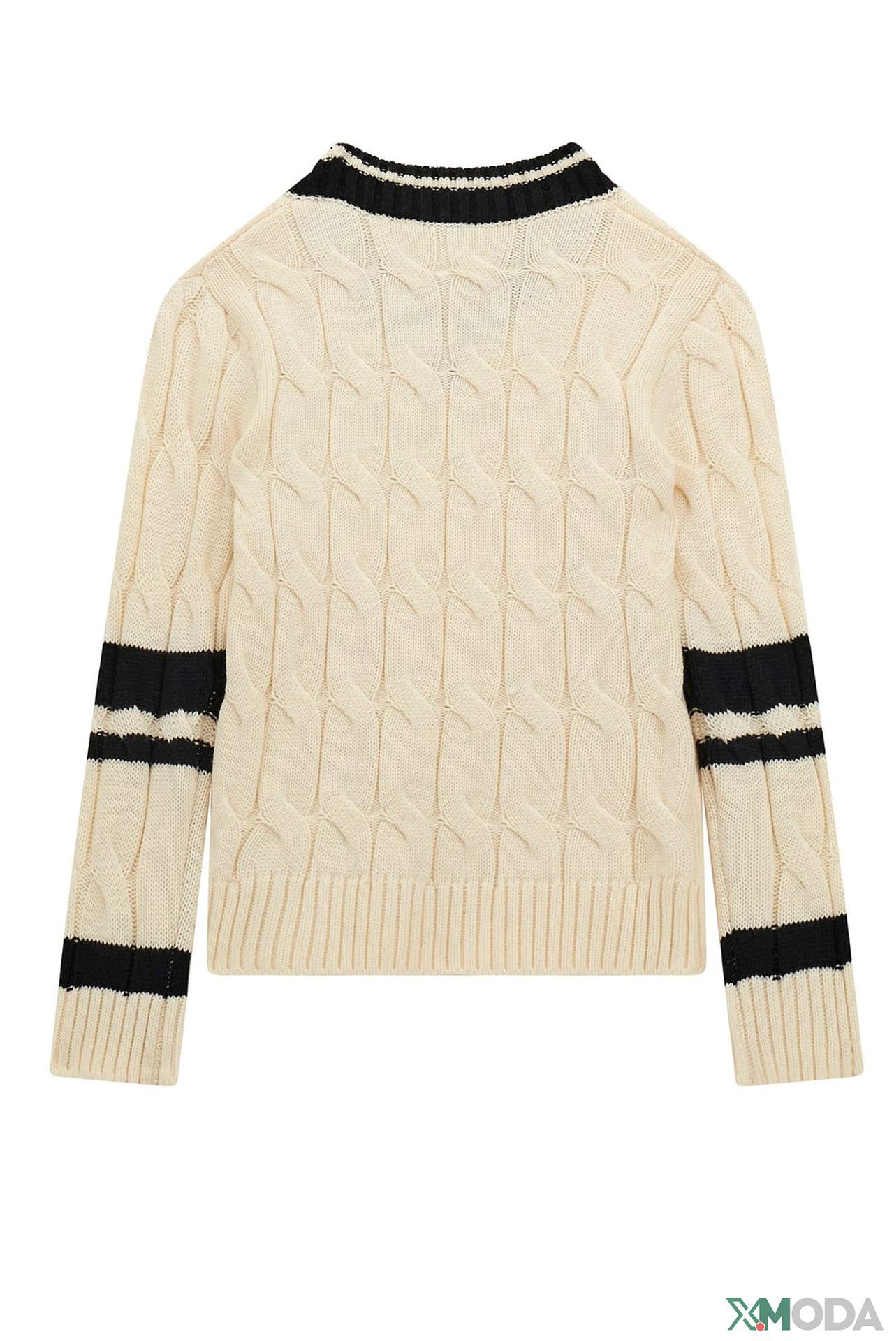 - Дизайн: Стильный бежевый джемпер с контрастными черными полосками на V-образном вырезе и рукавах создает модный спортивно-кэжуал образ. Оригинальная объемная вязка "косы" придает изделию уникальность и шарм.