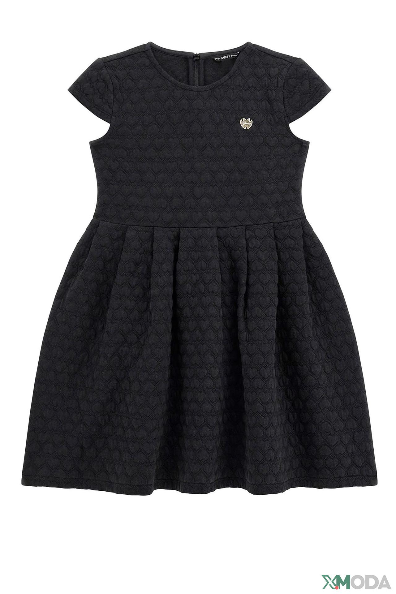 Элегантное черное платье от Guess для юной модницы. Модель украшена нежным тиснением в виде сердечек по всей поверхности, что придает изделию особый шарм. Платье идеально подойдет для любого случая, будь то праздничное событие или повседневный образ.