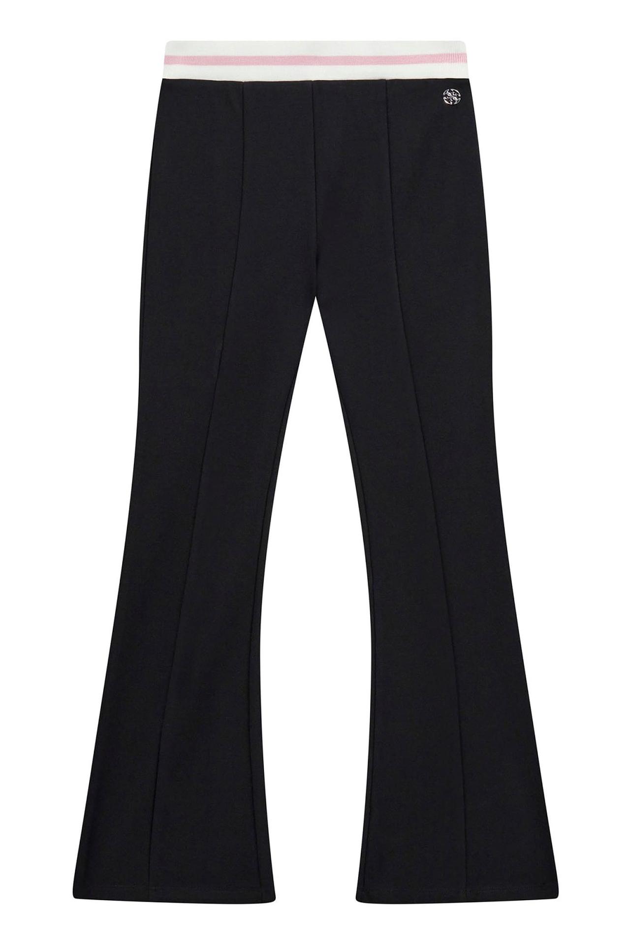 - Дизайн: Расклешенный крой от бедра создает модный силуэт. Декоративная полоса на поясе в розово-белых тонах придает брюкам игривый и нарядный вид.