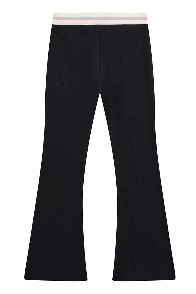 Брюки имеют удобный эластичный пояс с декоративной полосой в розово-белую полоску, обеспечивающий комфортную посадку. Крой брюк – клёш, что придает образу ретро-стиль и позволяет девочке чувствовать себя свободно и уверенно.