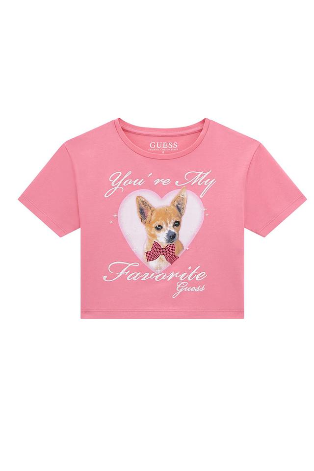Розовая футболка Guess для девочек с ярким принтом в виде чихуахуа в сердечке. Изготовлена из мягкого хлопка с добавлением эластана для комфорта и свободы движений. Стильный и милый образ для юных модниц! Состав: хлопок 95%, эластан 5%