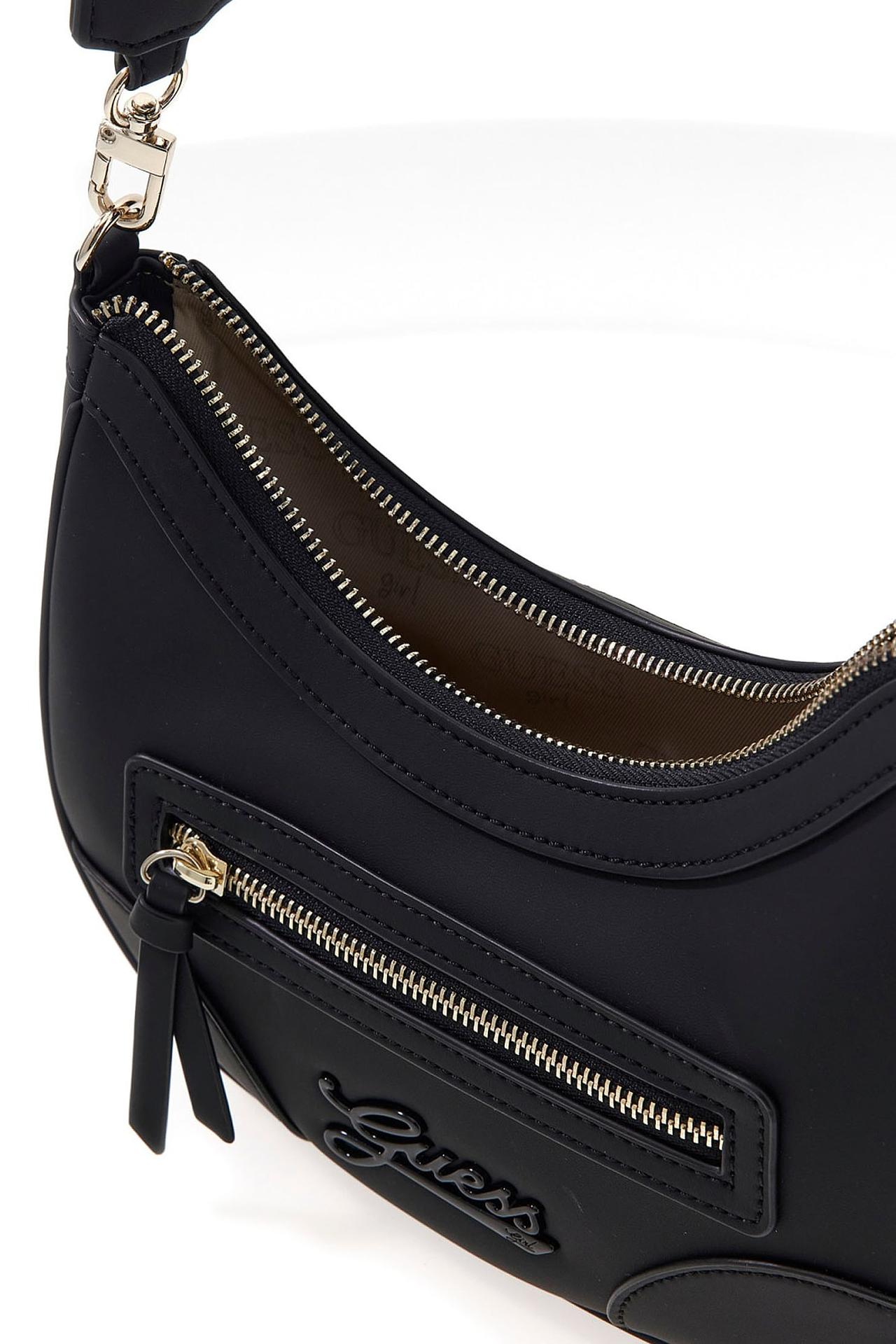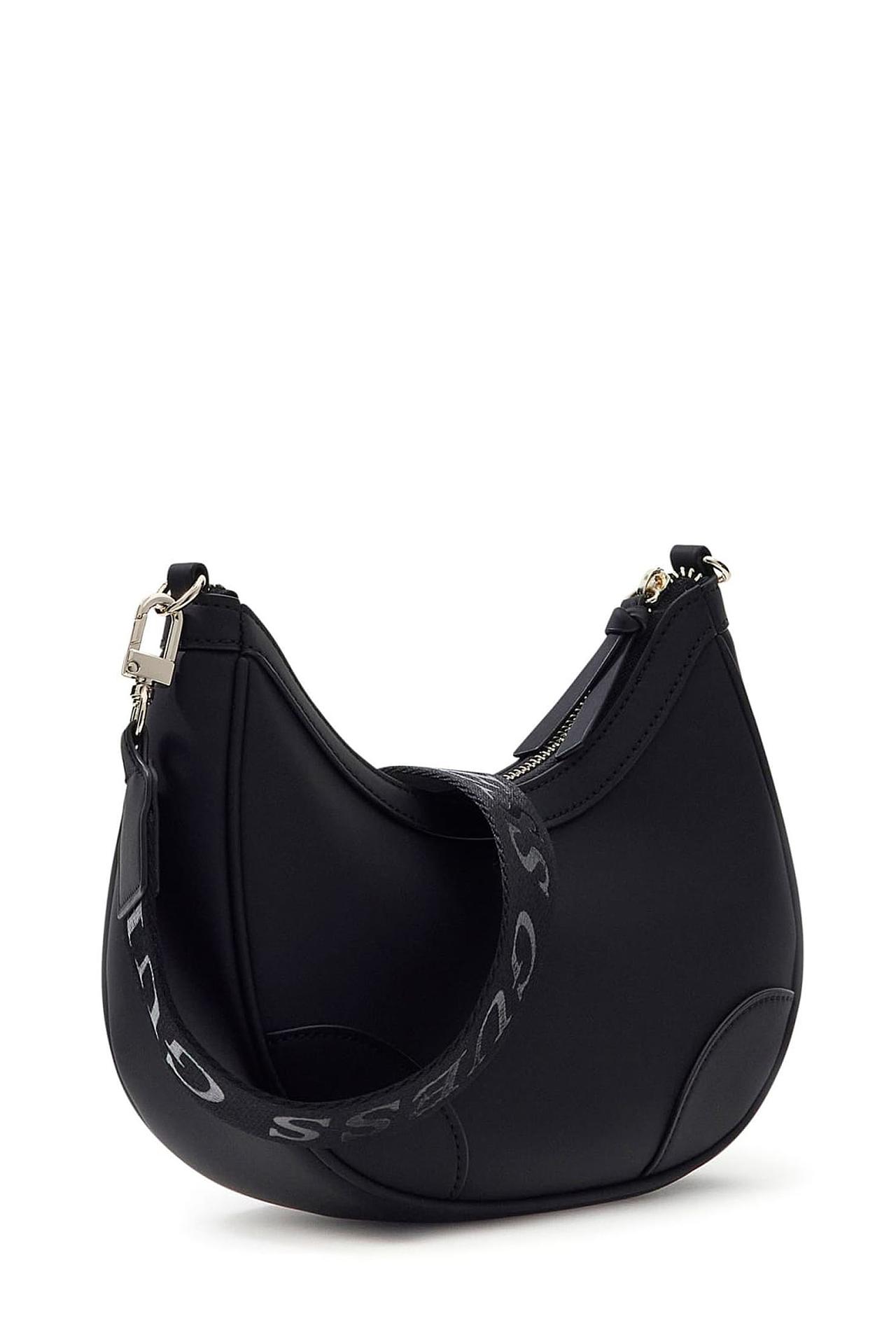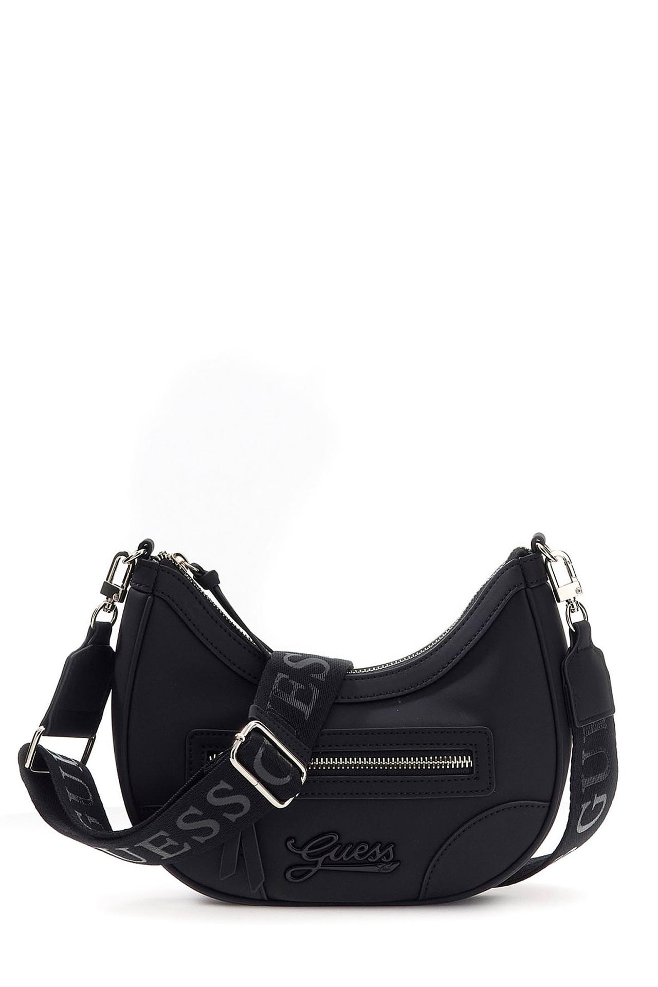 - Дизайн: Классическая форма полумесяца с регулируемым плечевым ремнем, украшенным логотипами Guess. Декоративный элемент в виде объемного логотипа Guess на передней части сумки.