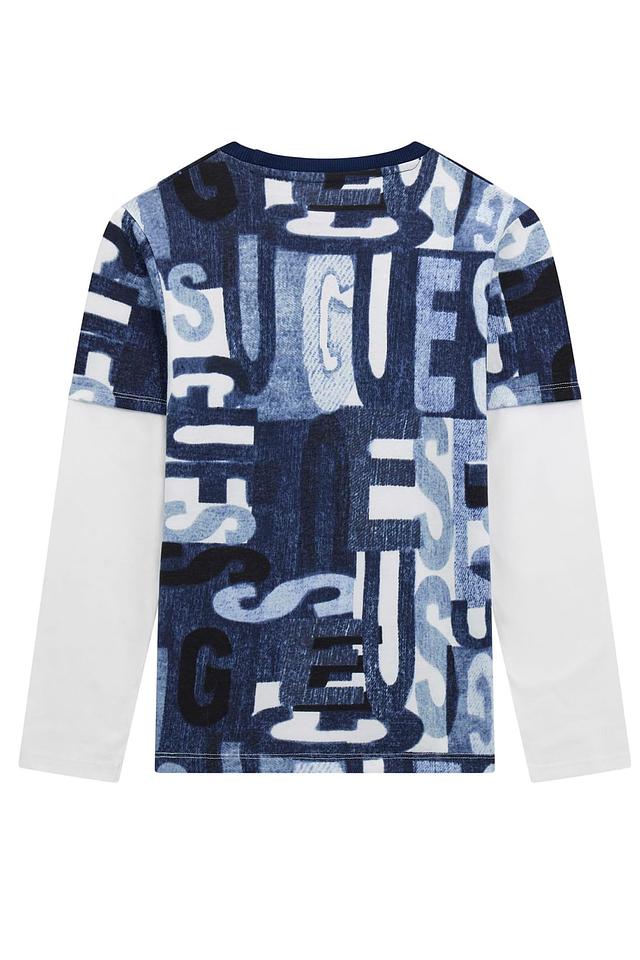 Футболка имеет синий цвет с оригинальным принтом, состоящим из повторяющихся логотипов бренда в различных оттенках. Длинные рукава делают ее подходящей для прохладной погоды или для ношения в помещении.