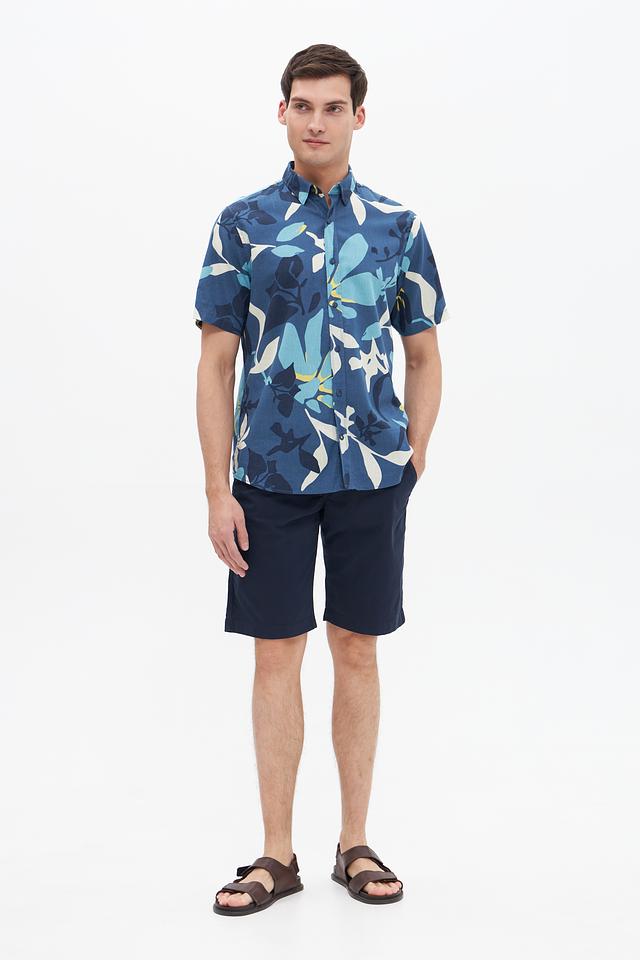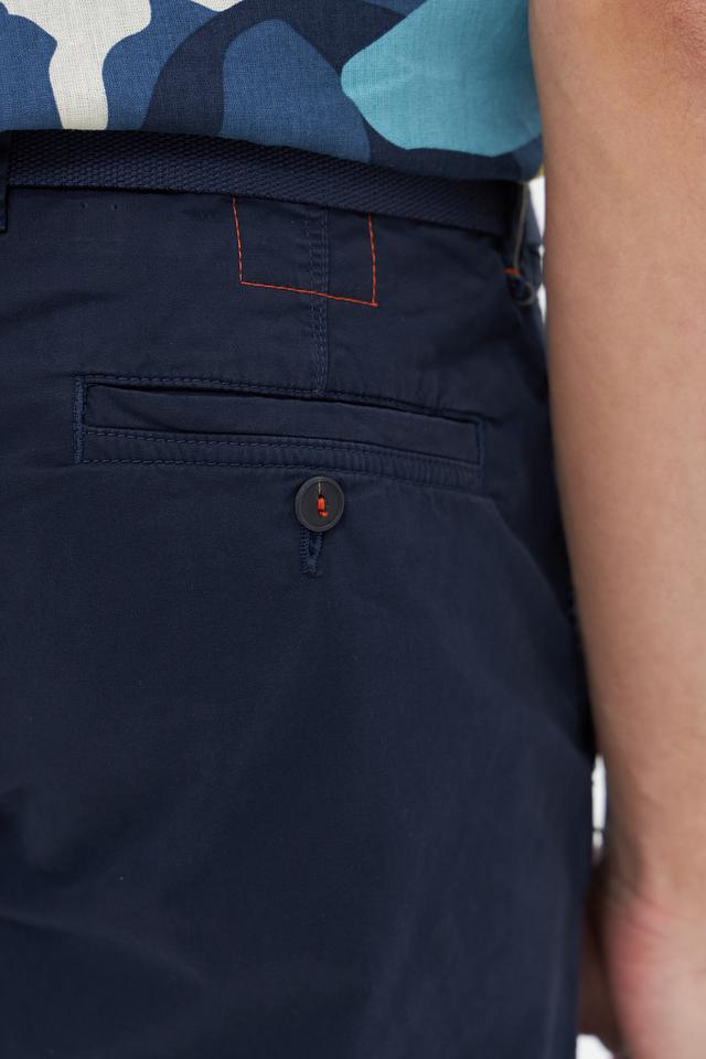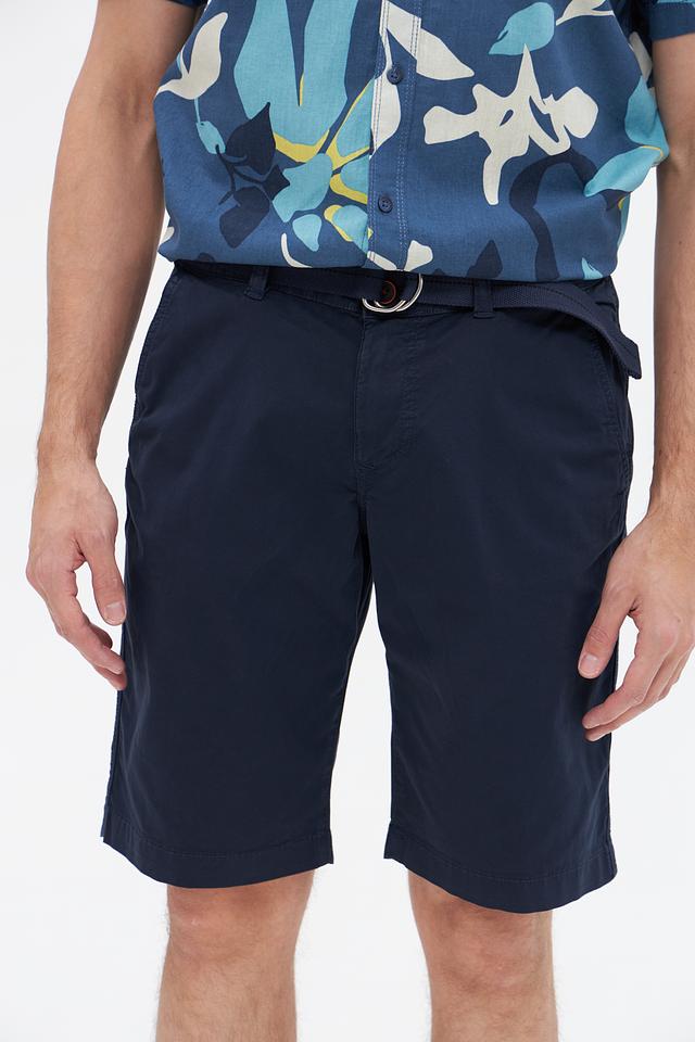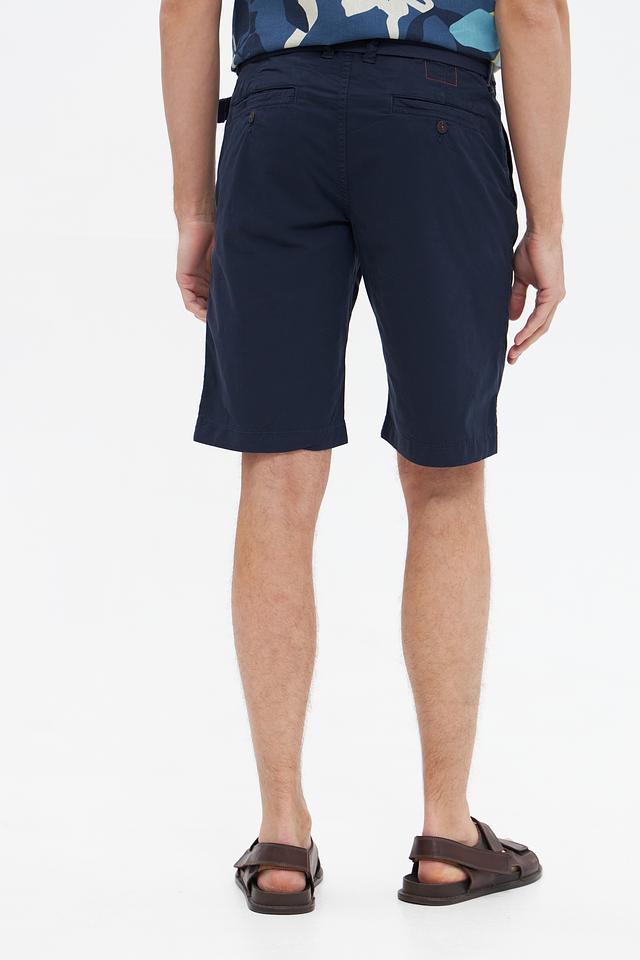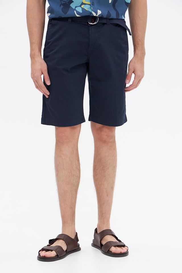 Цвет шорт – темно-синий, универсальный и легко сочетаемый с различными элементами гардероба. Модель оснащена стандартным поясом с петлями для ремня и боковыми карманами. Застежка – молния и пуговица. Задние карманы втачные, с клапанами. Данные шорты станут отличным выбором для повседневной носки в теплую погоду.