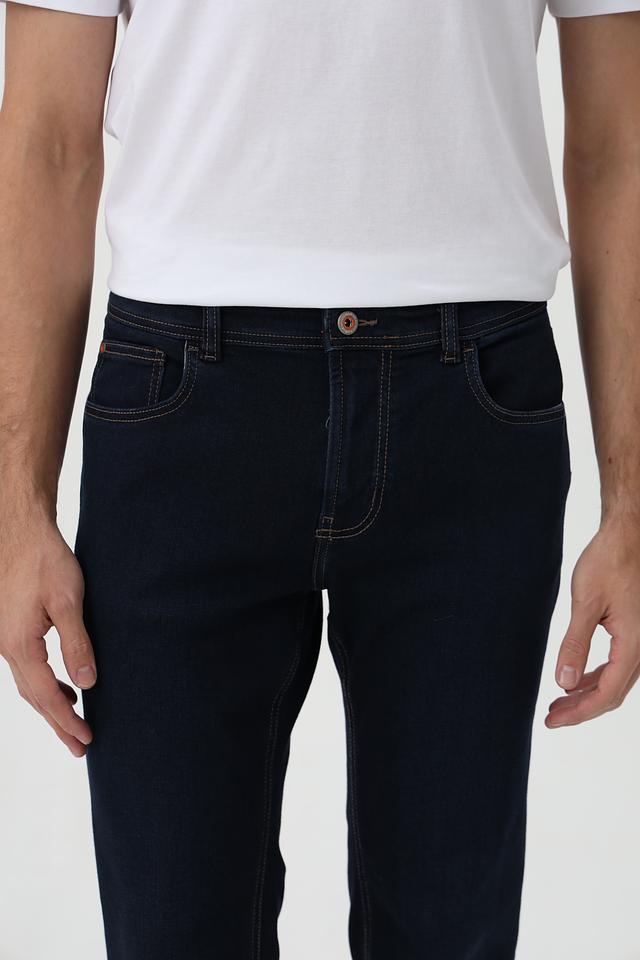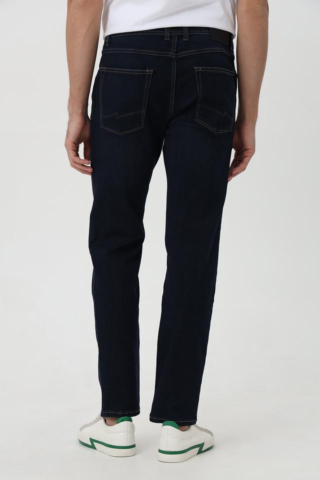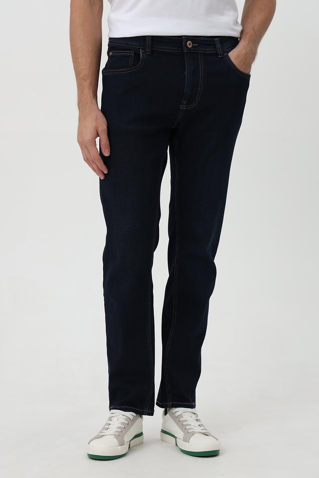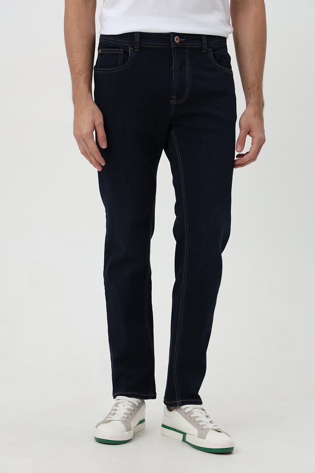 Классические мужские джинсы от бренда Hattric. Модель выполнена в насыщенном синем цвете и отличается оригинальной контрастной отделкой швов и карманов бежевым цветом.