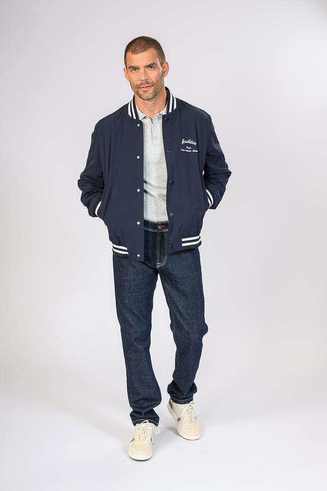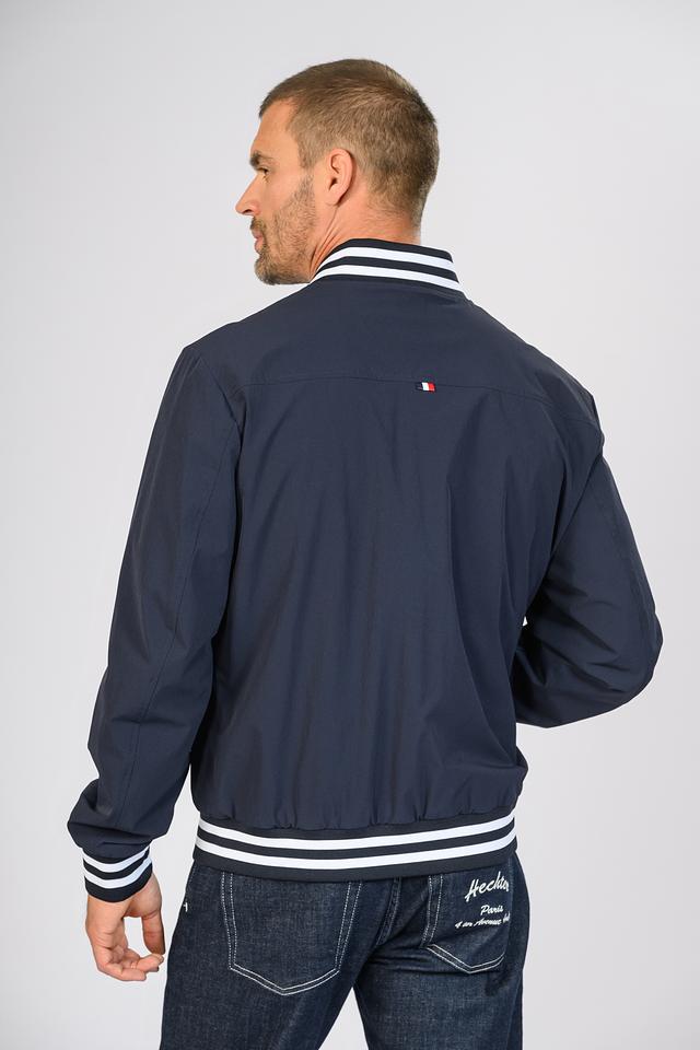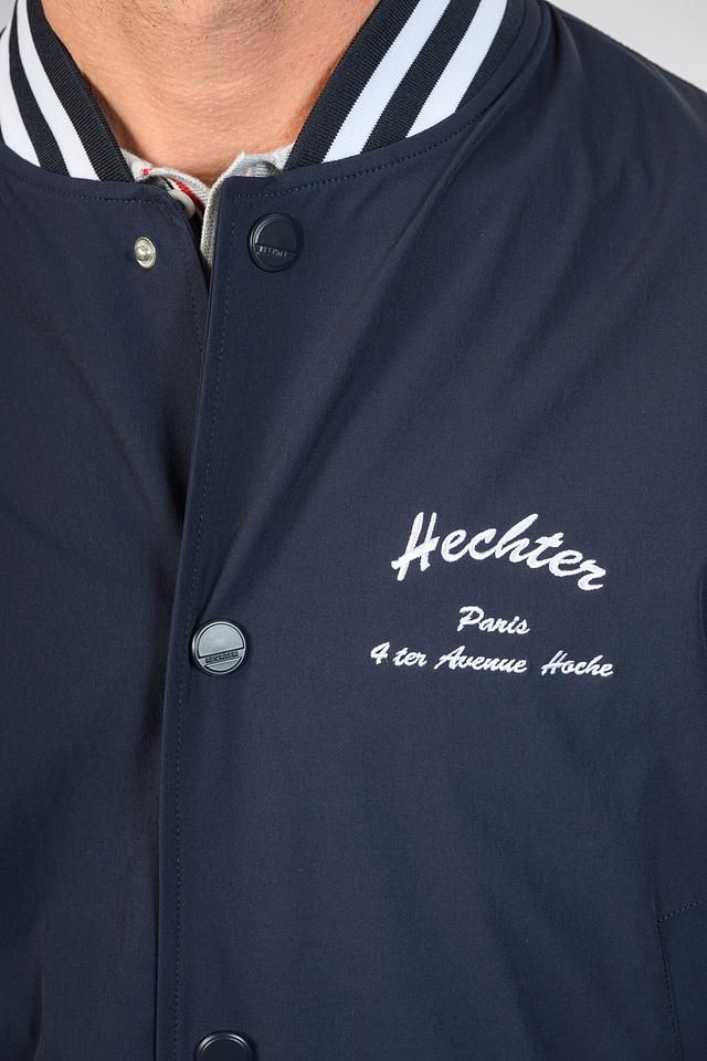 Дизайн куртки дополнен контрастной белой полосой на манжетах и по низу изделия. На груди расположена вышивка с логотипом бренда Hechter Paris. Эта ветровка станет отличным дополнением к вашему гардеробу и подойдет для различных погодных условий.