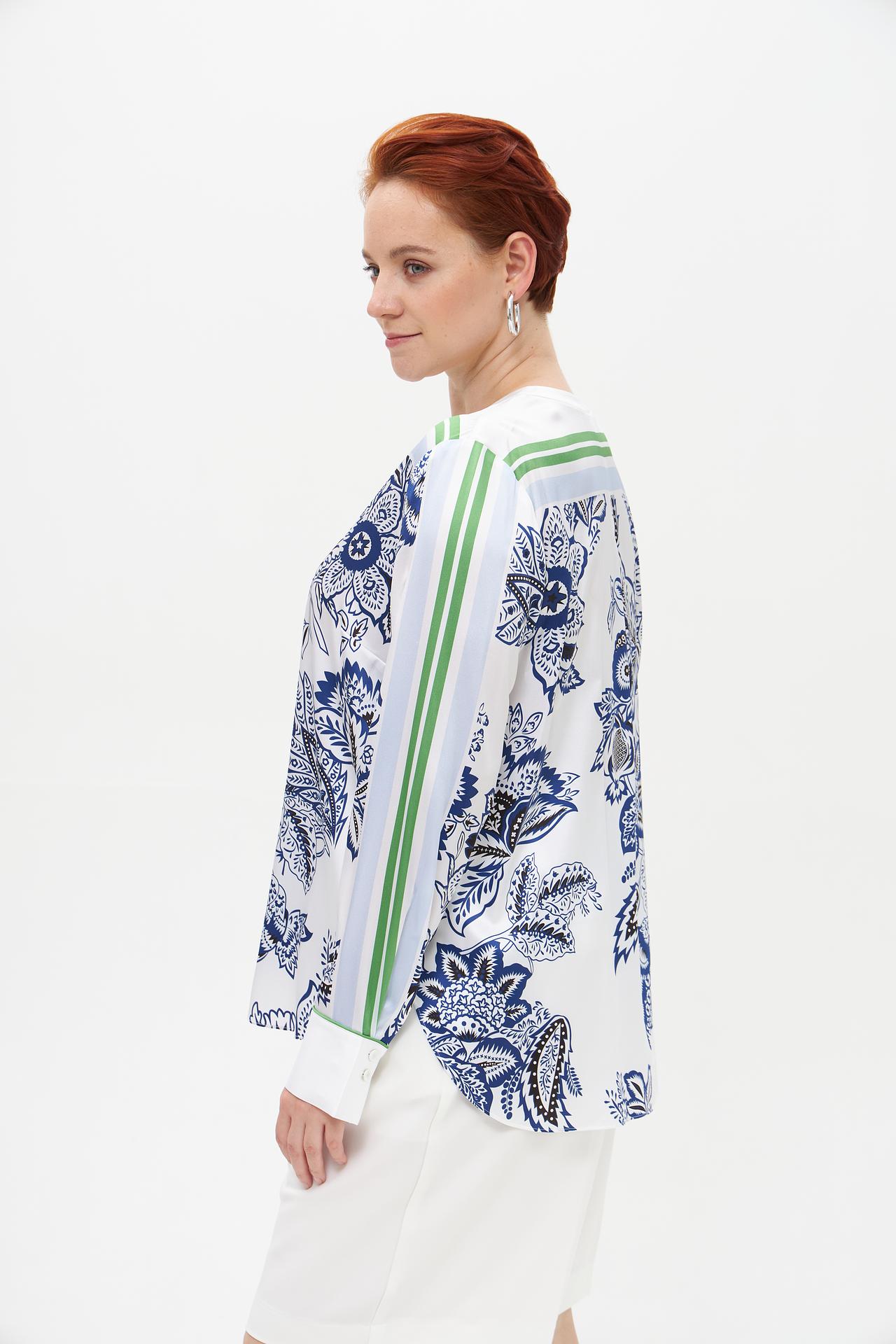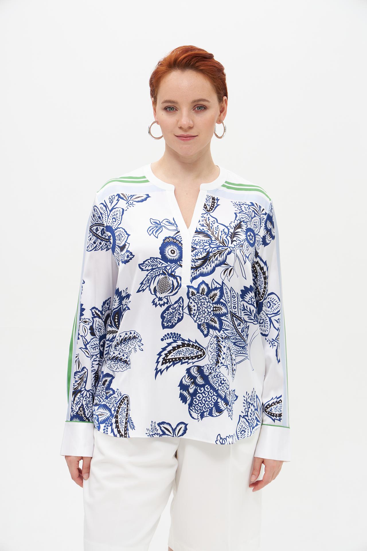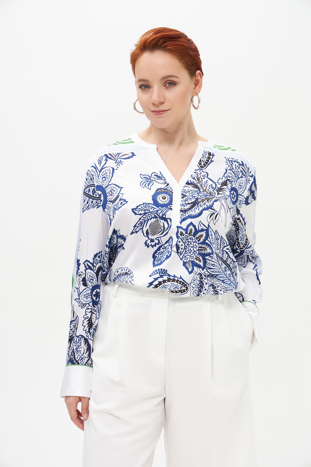 - Уникальный принт: Цветочный рисунок в синих тонах добавляет образу неповторимый шарм и женственность. Принт привлекает внимание и делает блузу запоминающейся.
