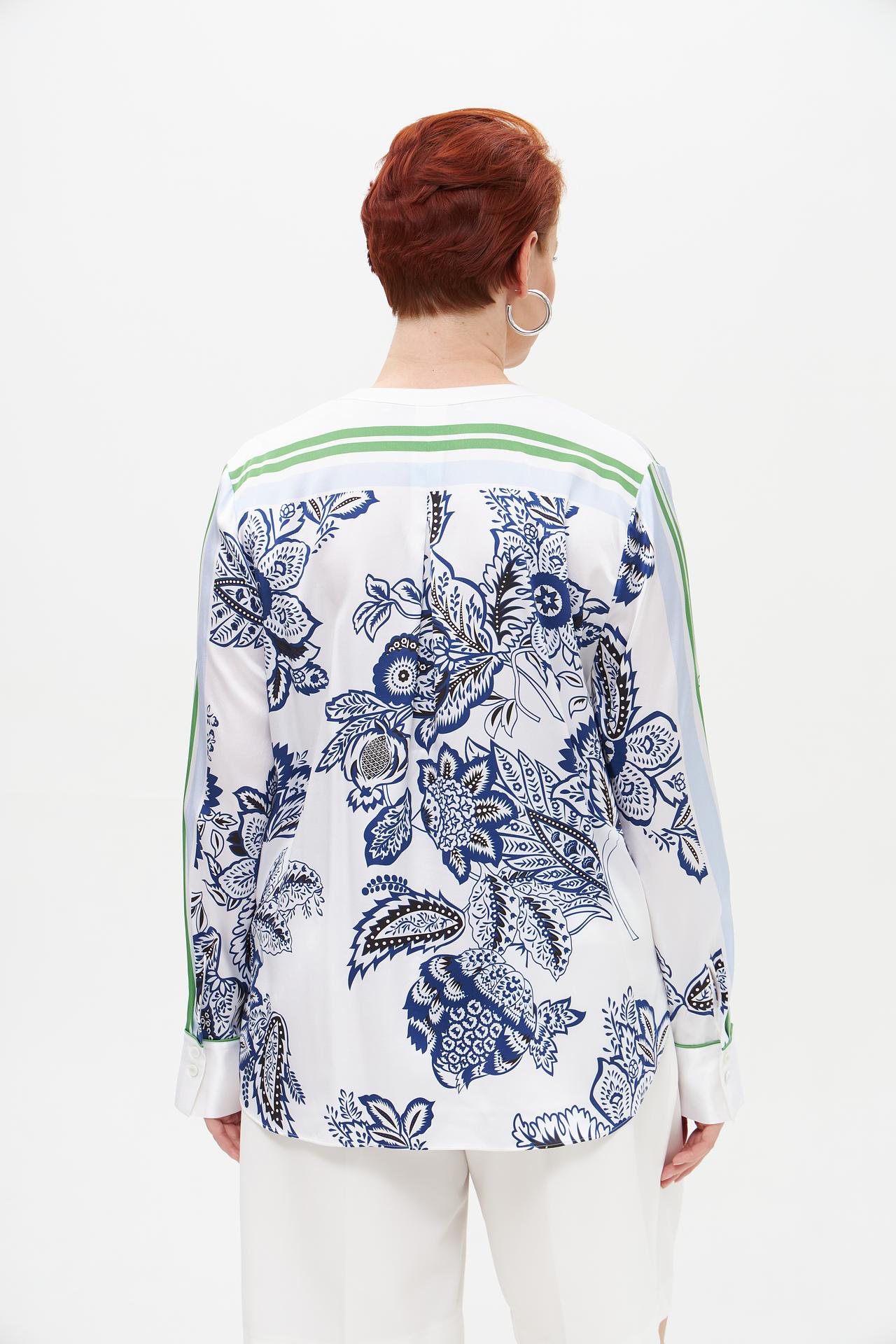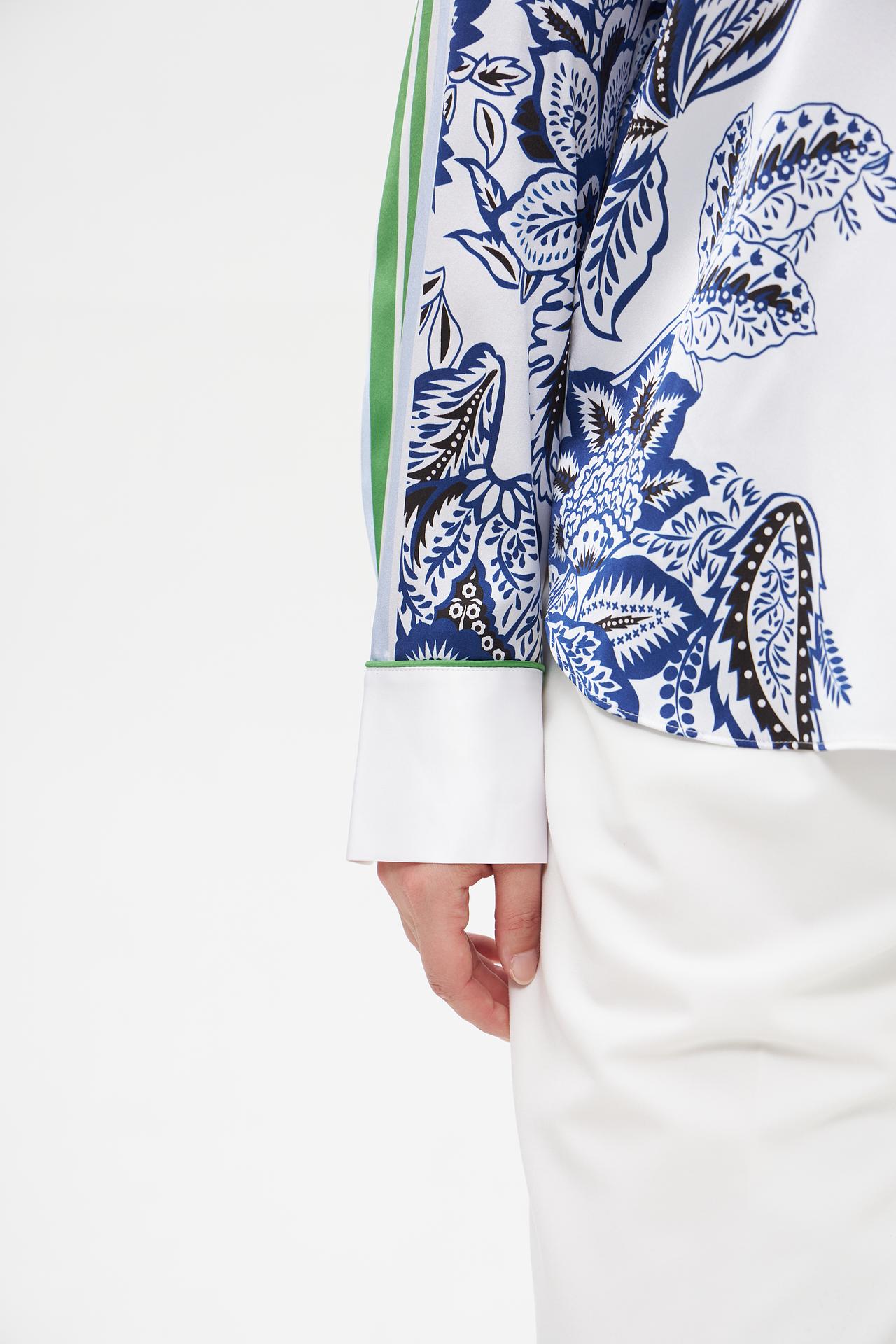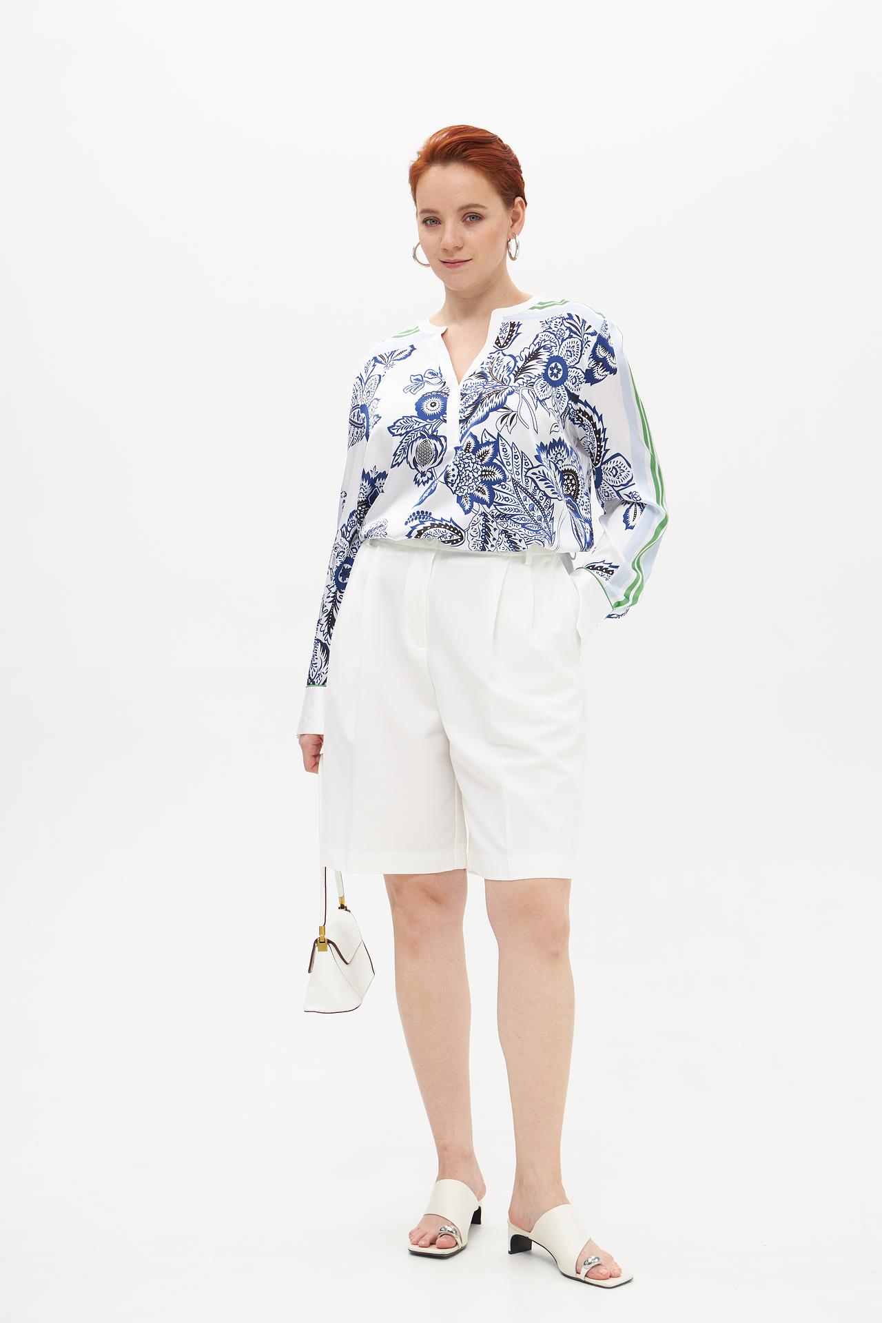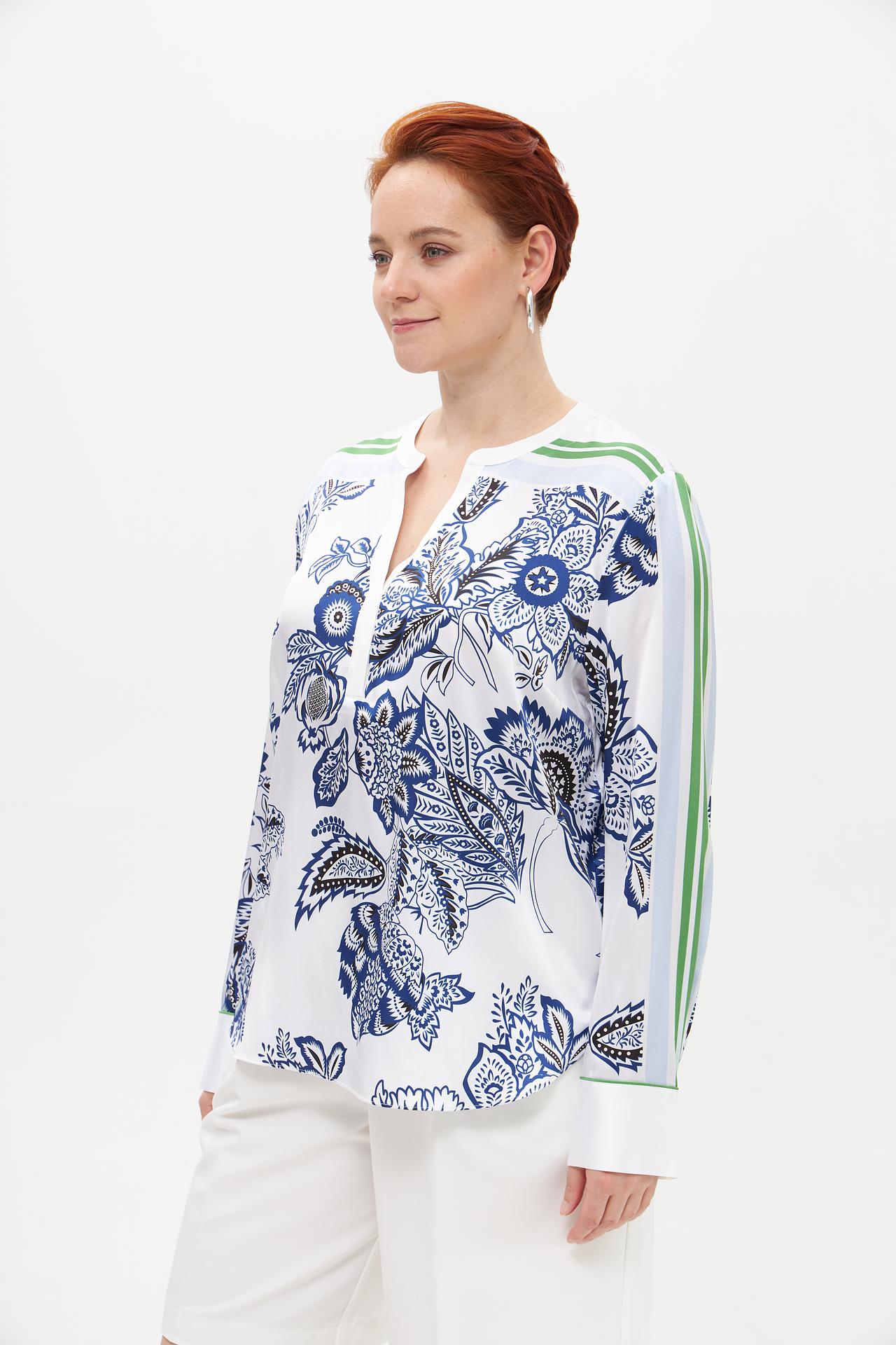 - Уникальный принт: Цветочный рисунок в синих тонах добавляет образу неповторимый шарм и женственность. Принт привлекает внимание и делает блузу запоминающейся.