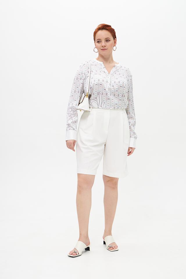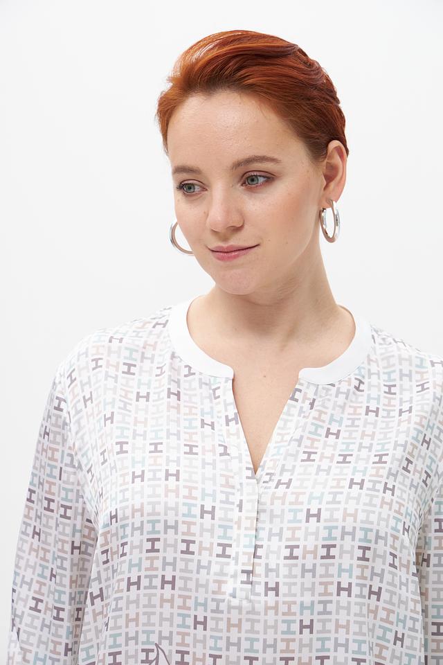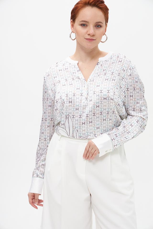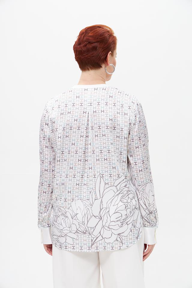 Модель имеет V-образный вырез и длинные рукава. Принт представлен в виде повторяющихся элементов и крупных изображений цветов. Блузка выполнена из высококачественного шёлка (95%) с добавлением эластана (5%), что обеспечивает комфорт при носке и приятные тактильные ощущения.
