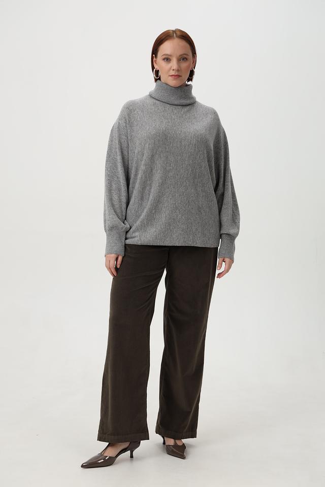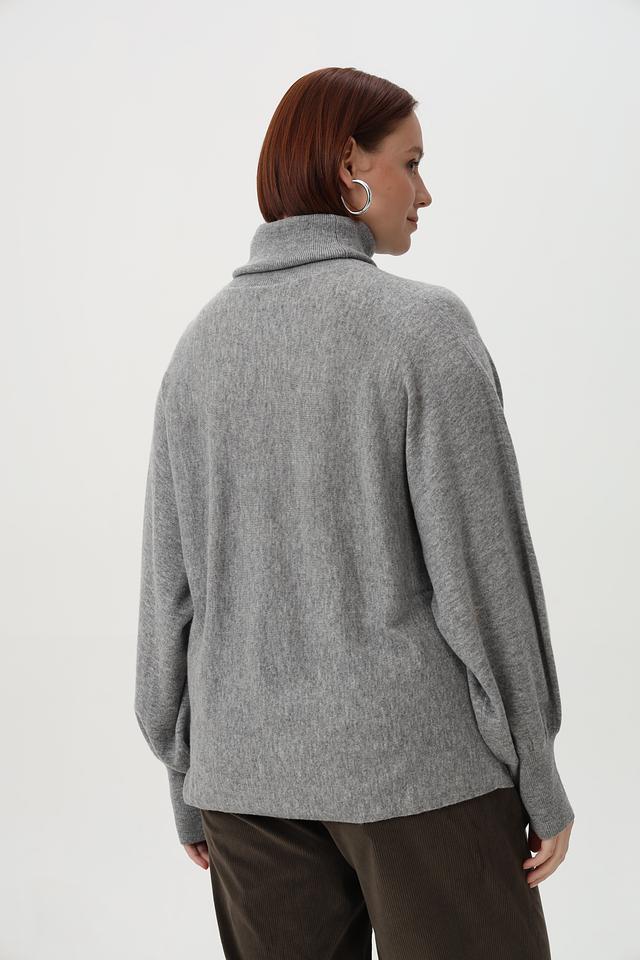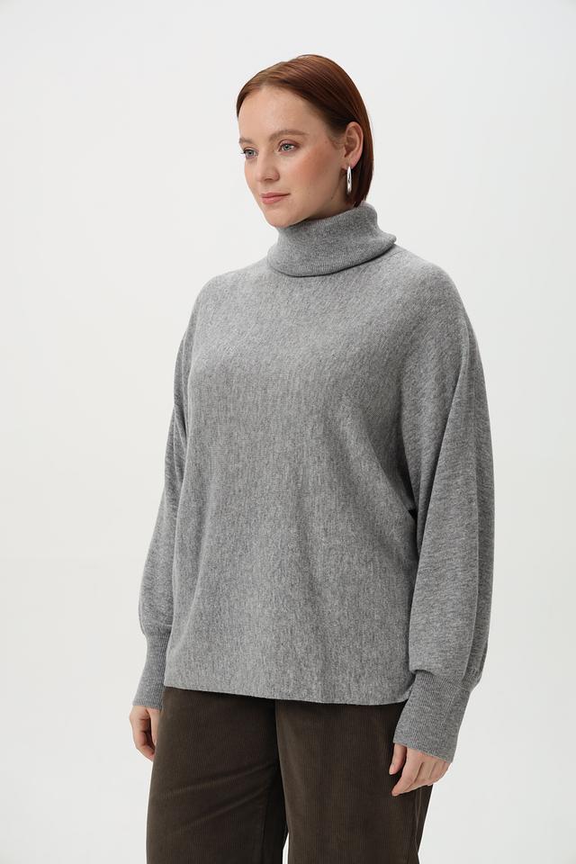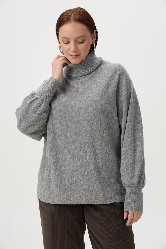 Пуловер имеет свободный крой, который не сковывает движений, и высокий горл, который защитит от холода. Объёмные рукава придают изделию лёгкость и оригинальность.