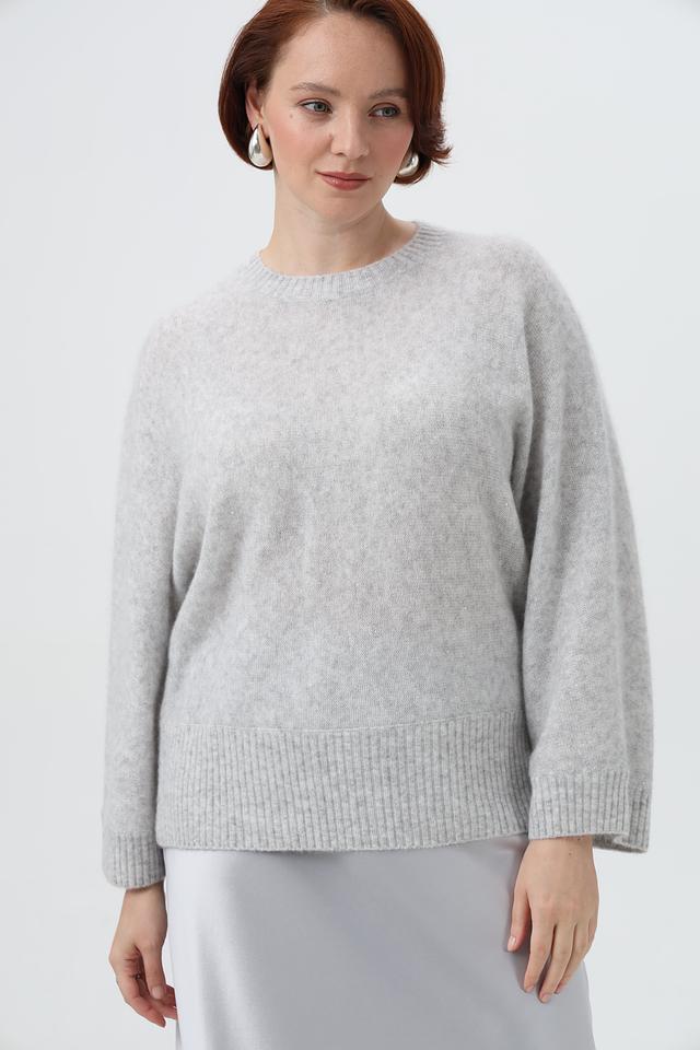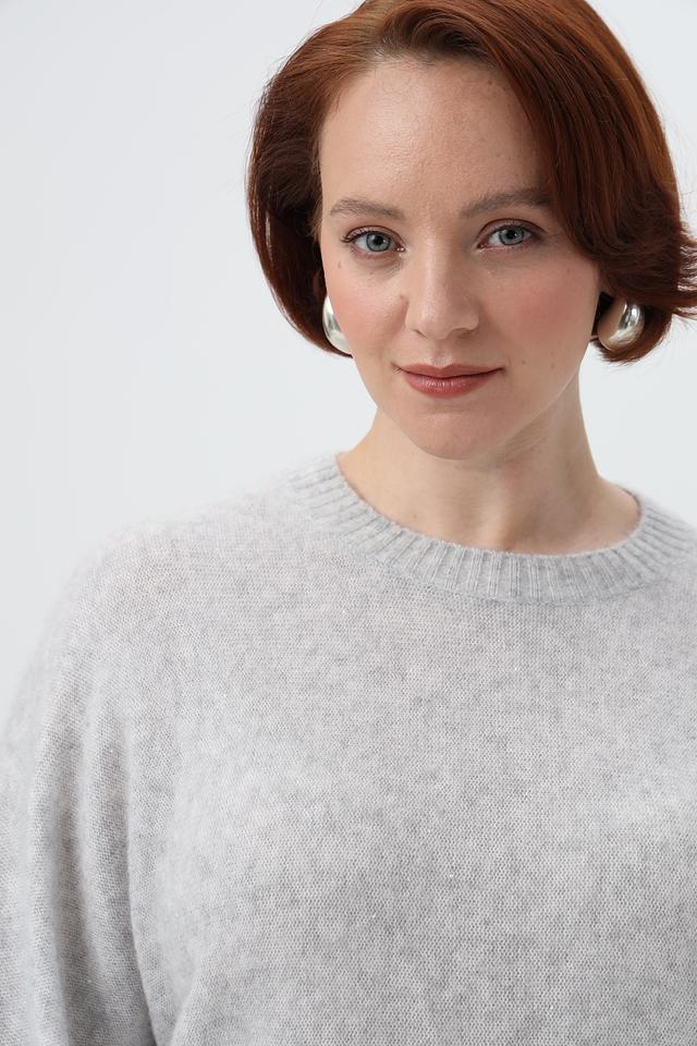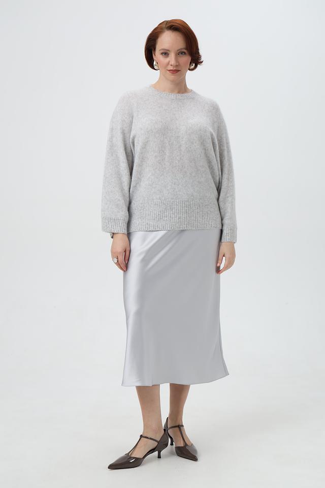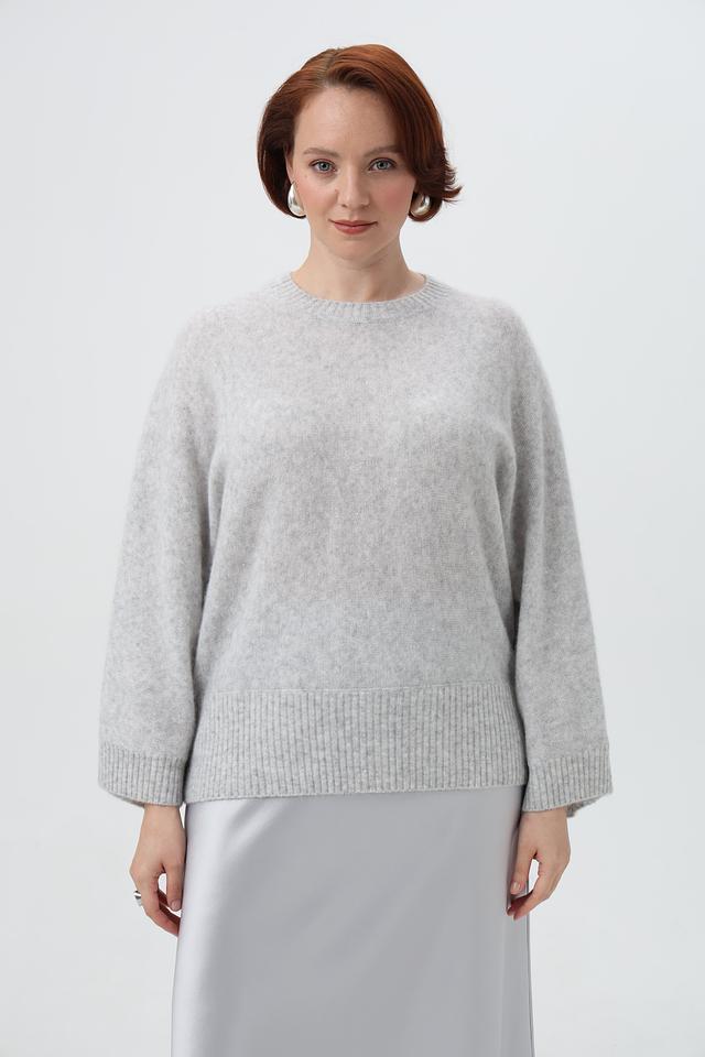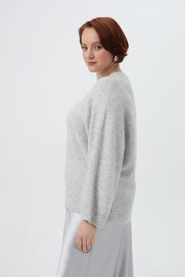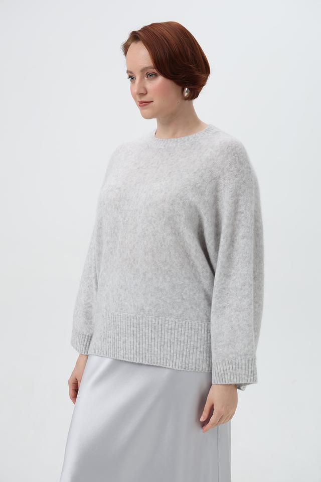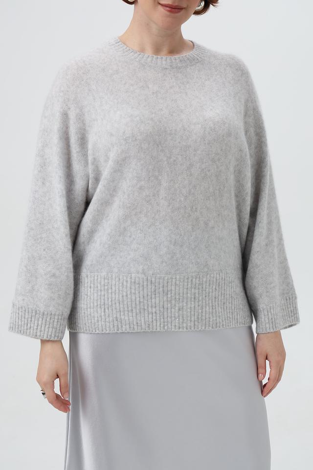 Модель выполнена в светло-сером цвете, который легко сочетается с различными элементами гардероба. Пуловер имеет классический крой с округлым вырезом горловины и рукавами три четверти, что делает его универсальным для любого случая.