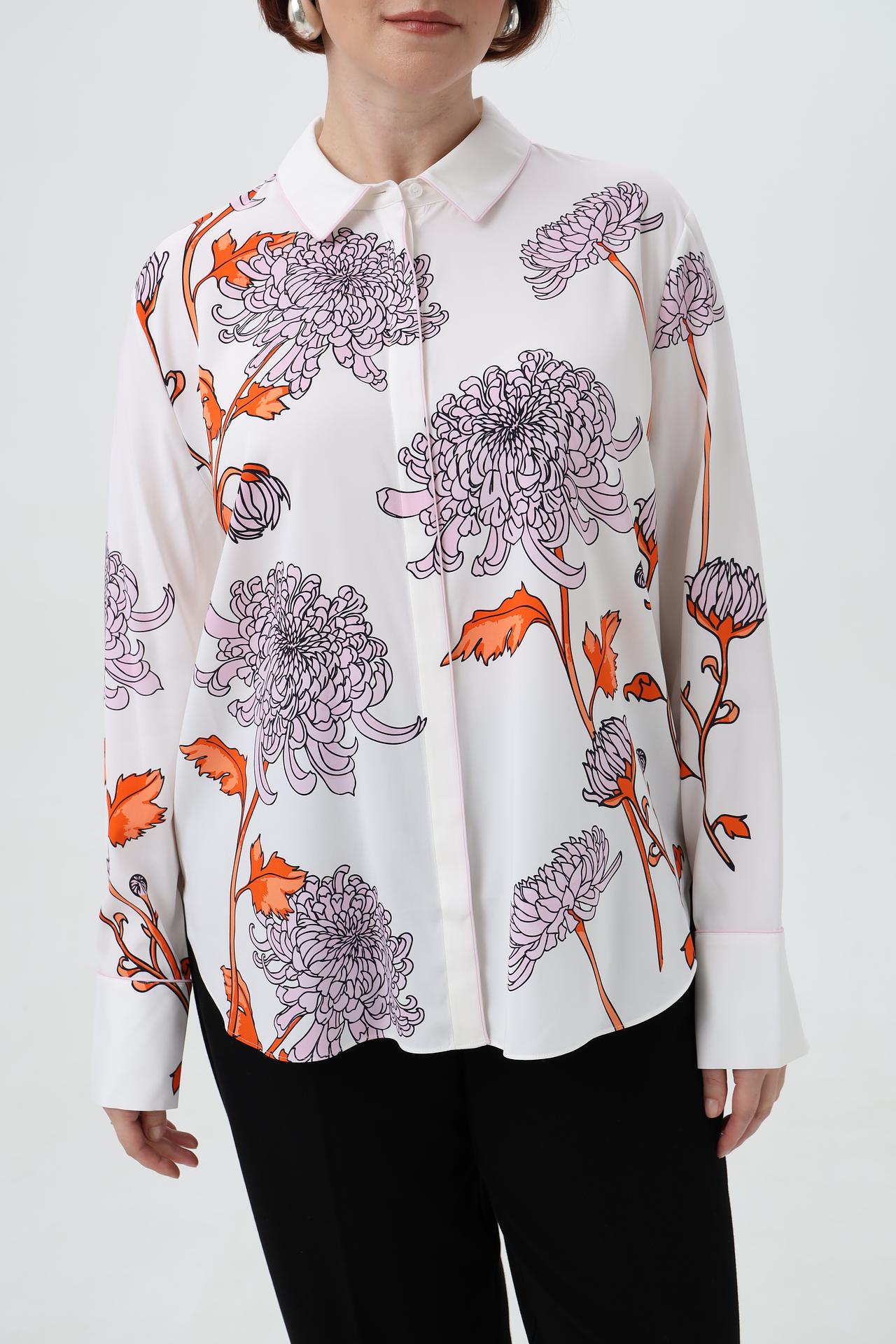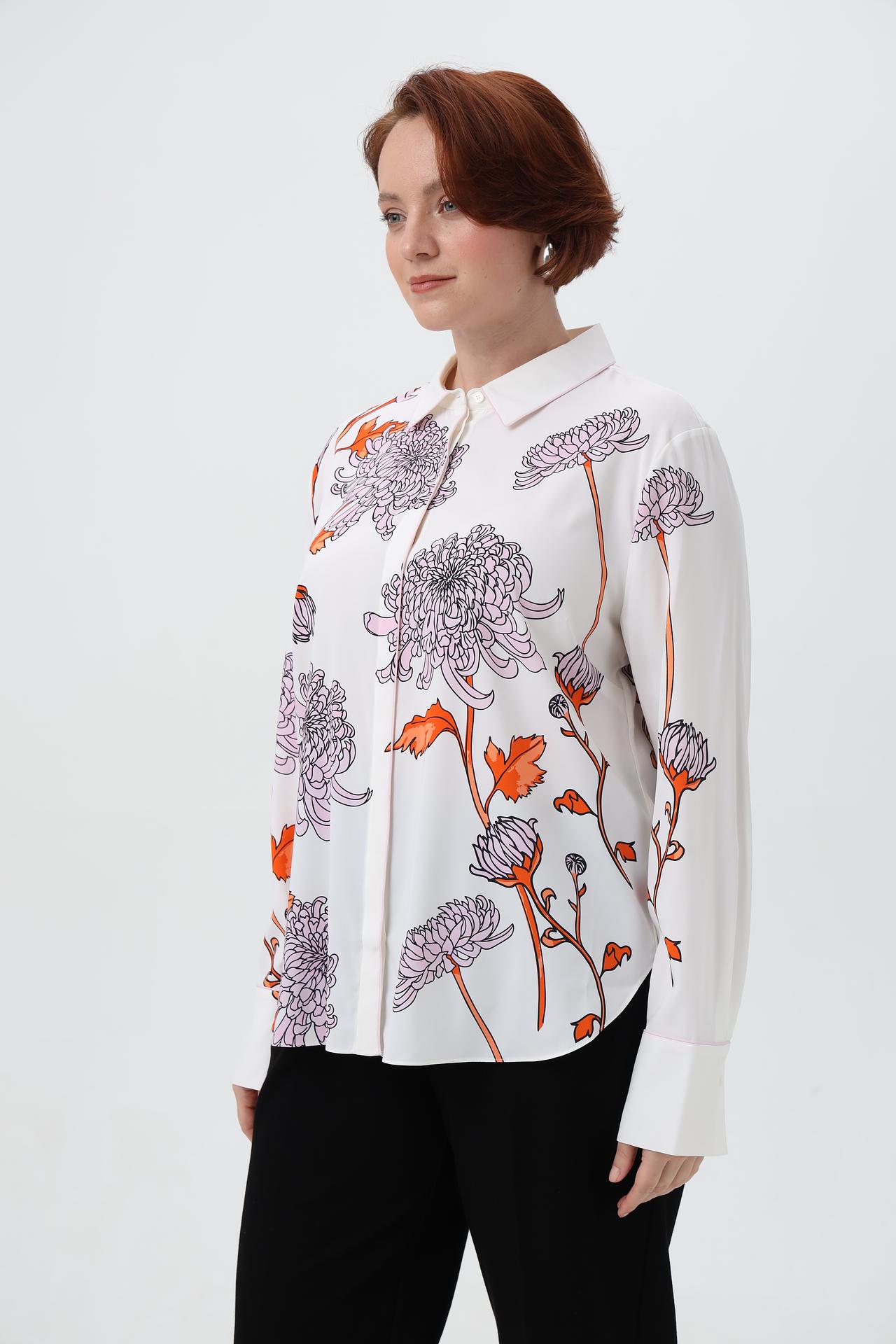 - Дизайн: Крупный, детально проработанный цветочный принт с акцентами оранжевого цвета на молочном фоне. Классический воротник и длинные рукава с манжетами.