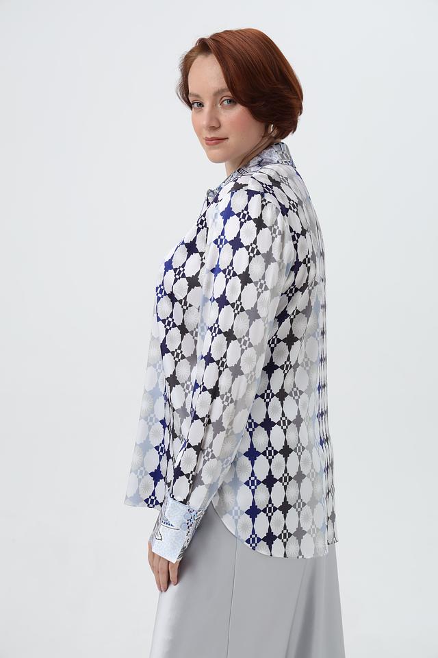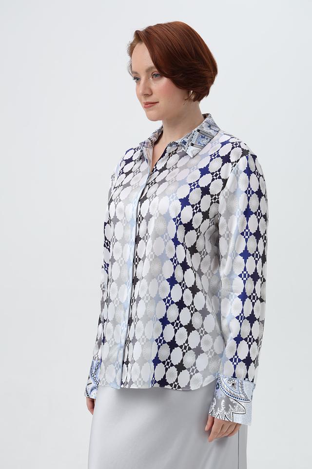 Эта блузка прекрасно сочетается с юбками, брюками и джинсами, позволяя создавать разнообразные образы – от деловых до повседневных. Декоративные манжеты с принтом добавляют изысканности и завершенности образу.