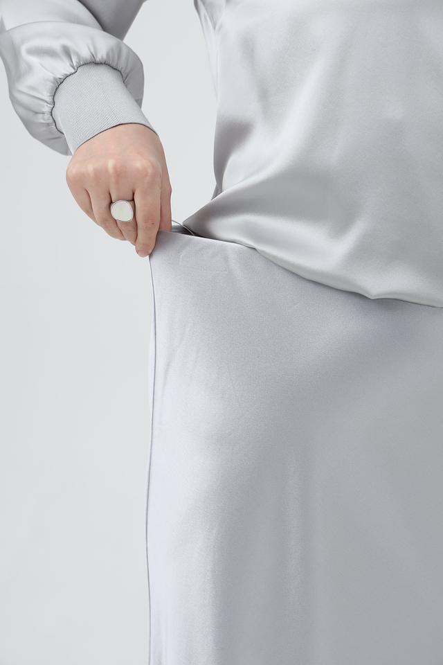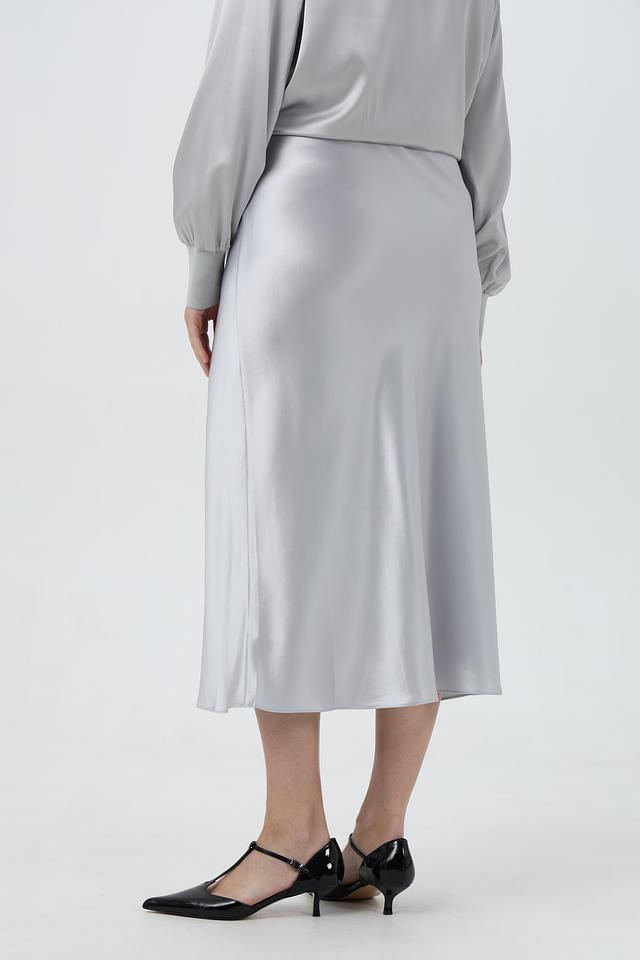 Модель выполнена из гладкого атласа серого цвета, который придает ей благородный вид. Прямой крой юбки обеспечивает комфортную посадку по фигуре, а миди-длина делает её подходящей для различных случаев.