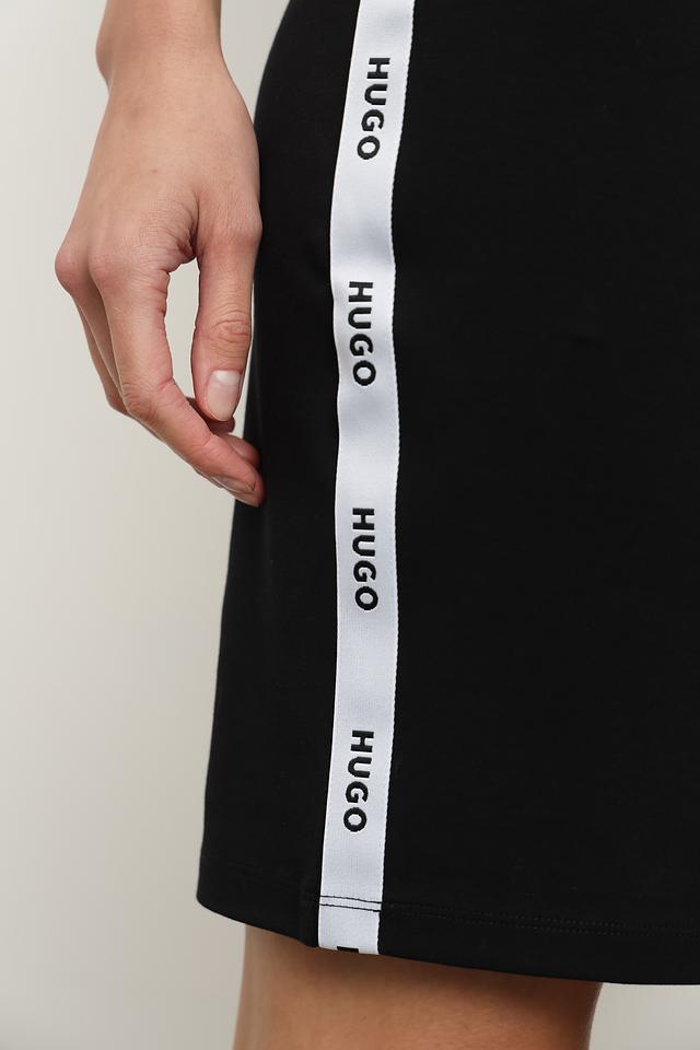 Особенностью модели является вырез на талии, который добавляет образу игривости и женственности. Боковые полоски с логотипом Hugo не только украшают платье, но и подчеркивают его принадлежность к известному бренду.