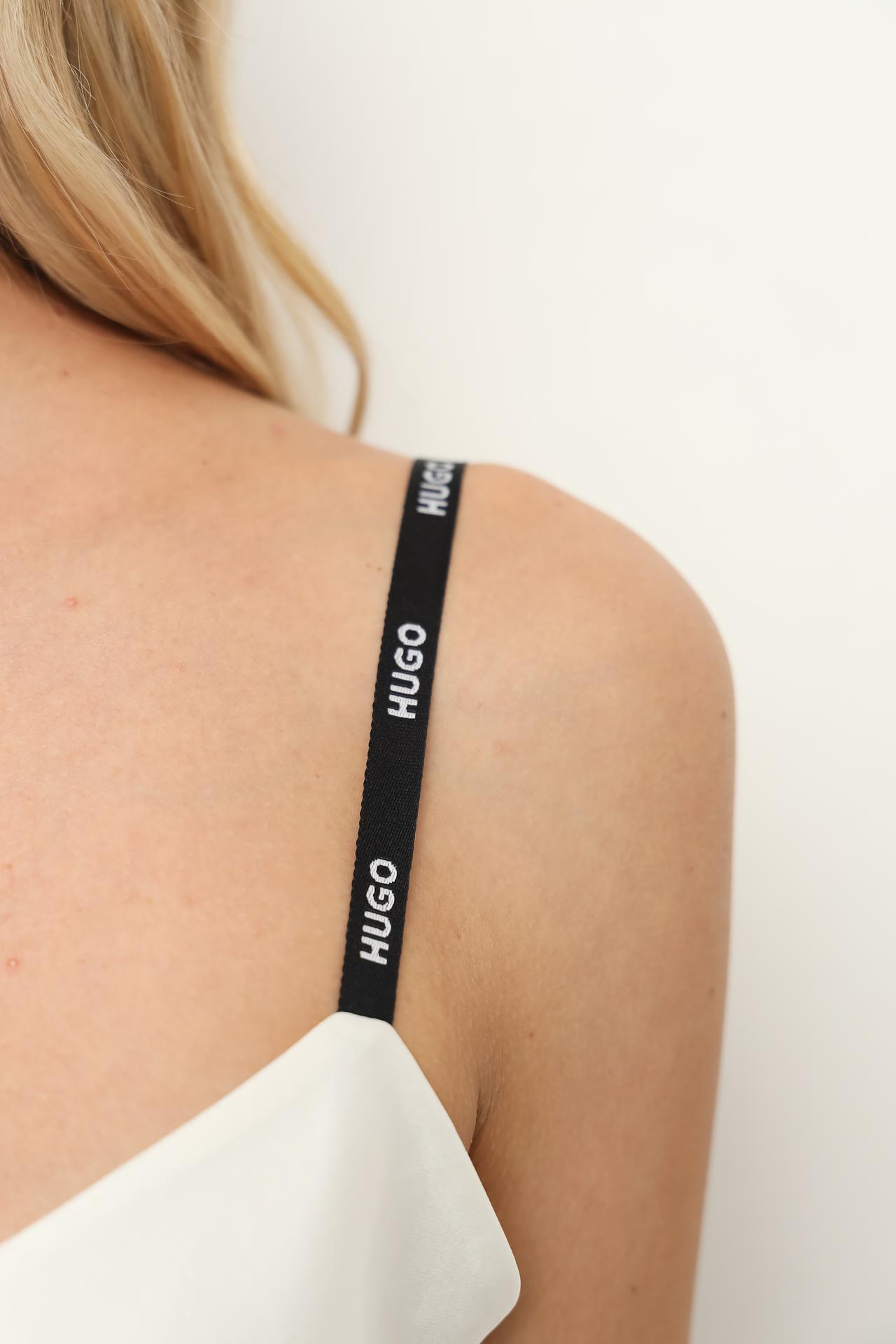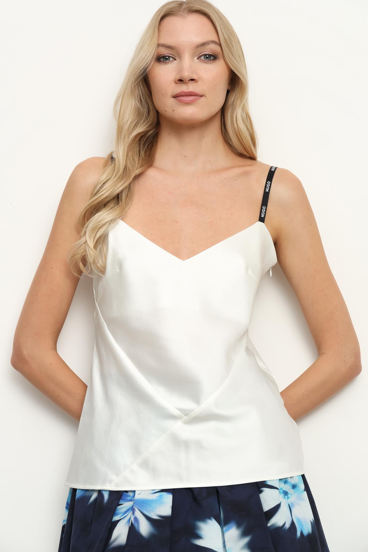 Элегантный белый топ Hugo станет прекрасным дополнением вашего гардероба. Изготовленный из 100% полиэстера, этот топ отличается своей легкостью и приятной на ощупь текстурой. V-образный вырез горловины и тонкие бретели с фирменным логотипом добавляют изысканности и стиля. Идеальный выбор для создания утонченных образов.
