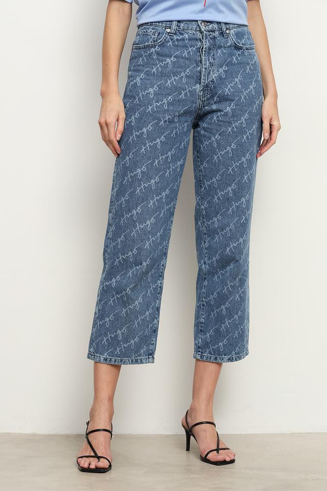 Джинсы имеют прямой крой и укороченную длину, что делает их идеальным выбором для создания модных образов. По всей поверхности ткани расположен повторяющийся логотип бренда, добавляющий изделию узнаваемость и оригинальность.