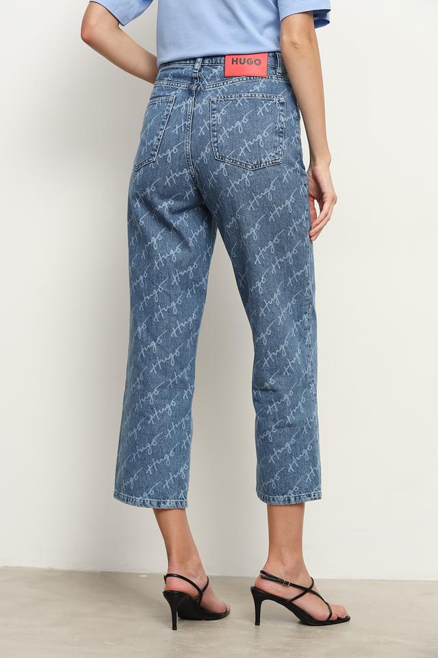 Женские джинсы Hugo голубого цвета с повторяющимся логотипом бренда по всей поверхности. Модель выполнена в актуальном укороченном крое и имеет классическую посадку. Состав: хлопок 100%