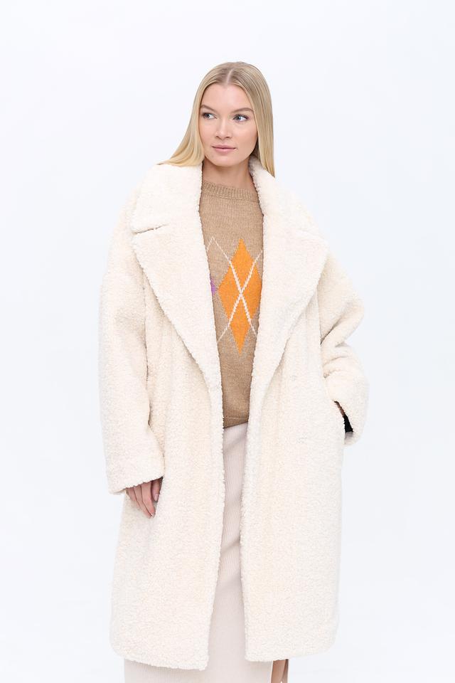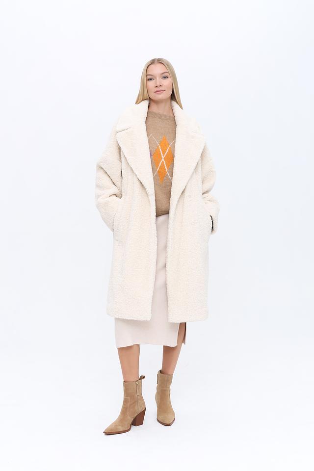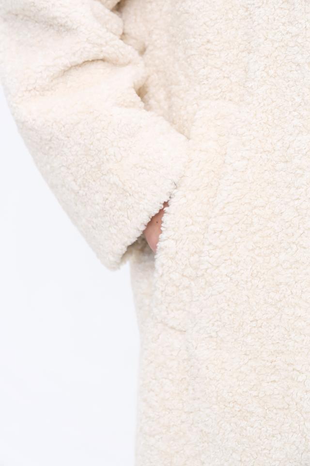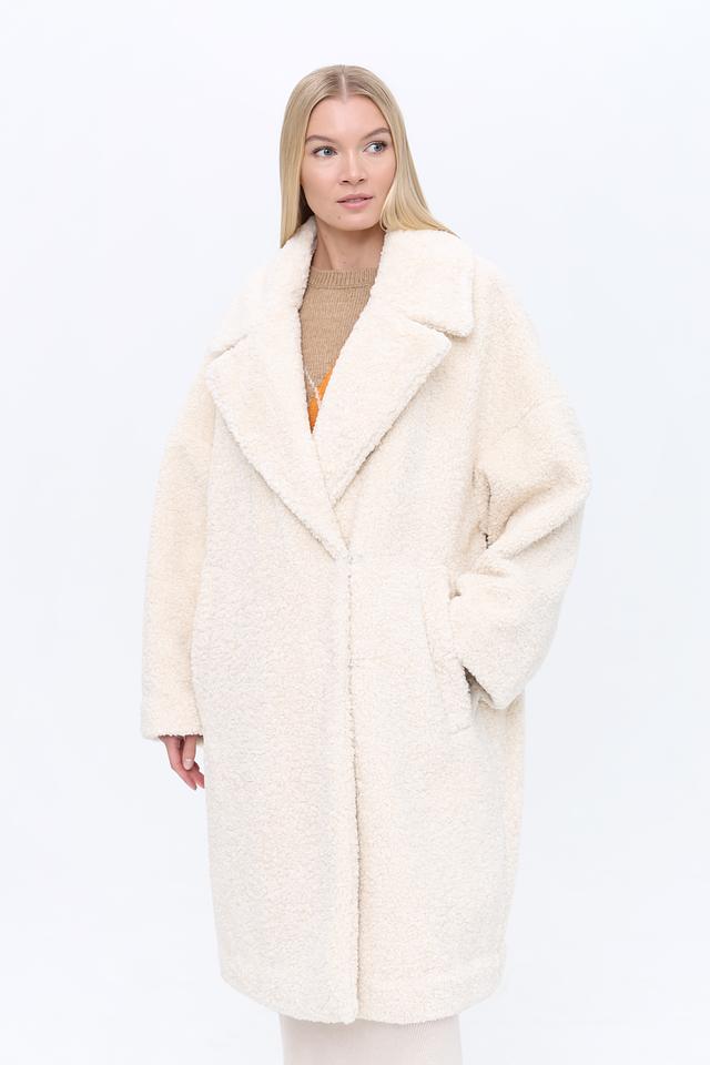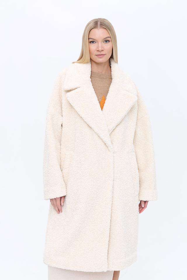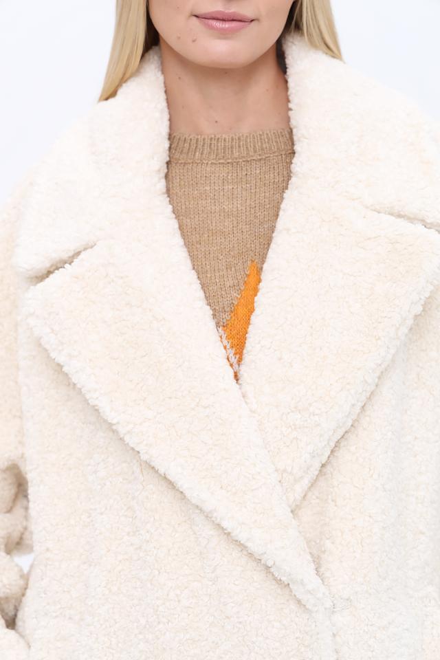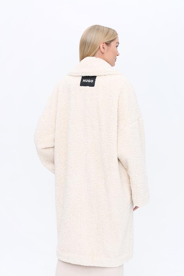 Кремовое пальто от Hugo выполнено из мягкого полиэстера, имитирующего мех. Модель имеет свободный крой и отложной воротник, а также фирменную нашивку с логотипом на спине. Состав: полиэстер 100%