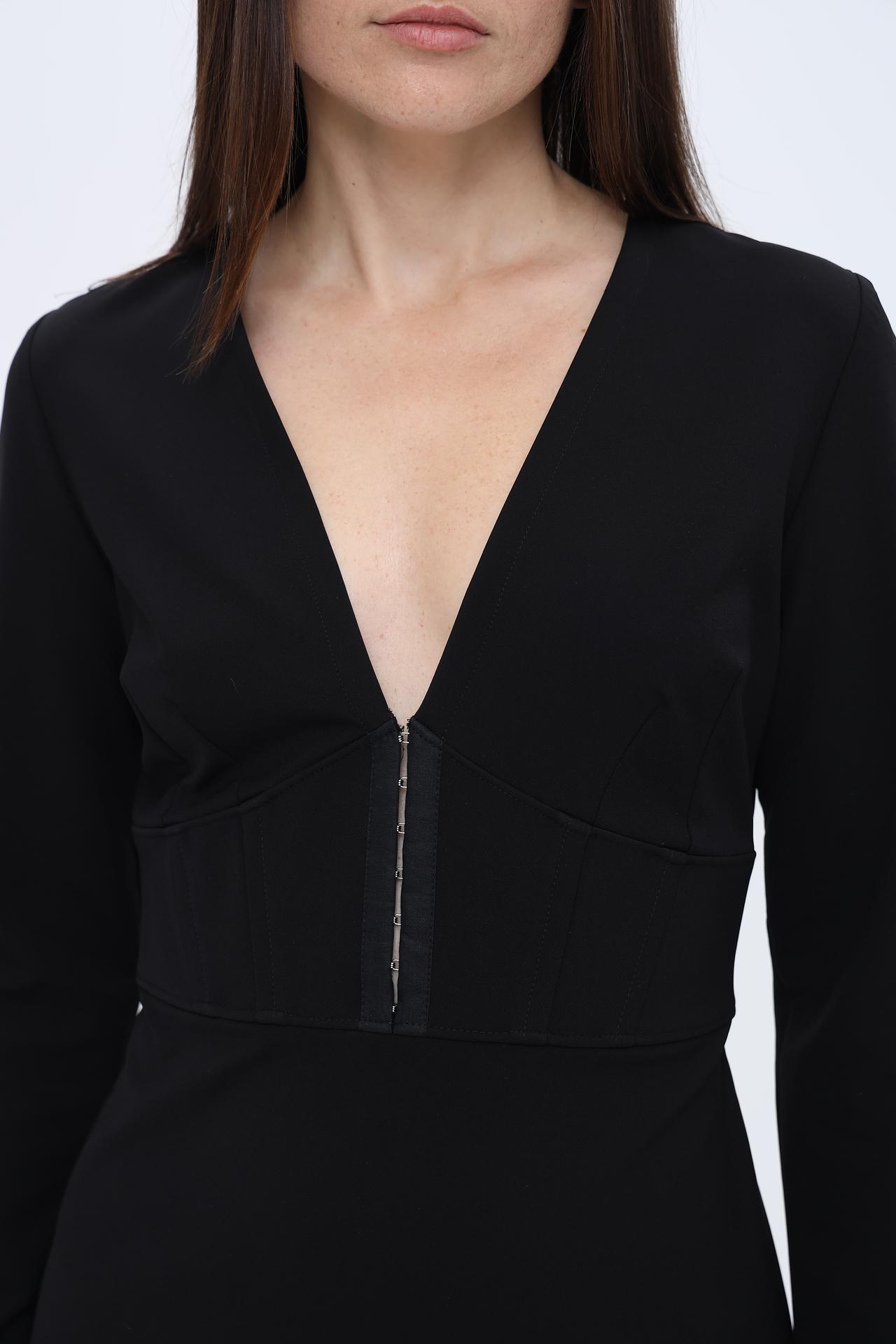 - Дизайн: Минималистичный крой и глубокий V-образный вырез с декоративной застежкой создают эффектный и запоминающийся образ. Платье прекрасно подойдет как для офиса, так и для вечернего выхода.