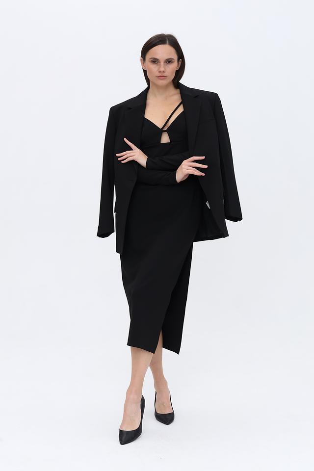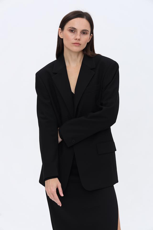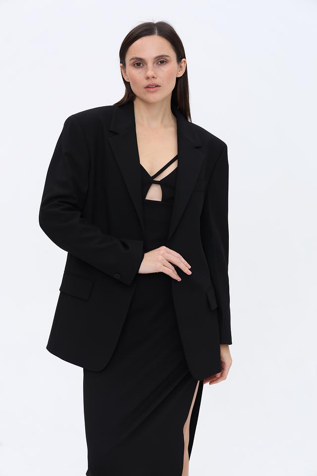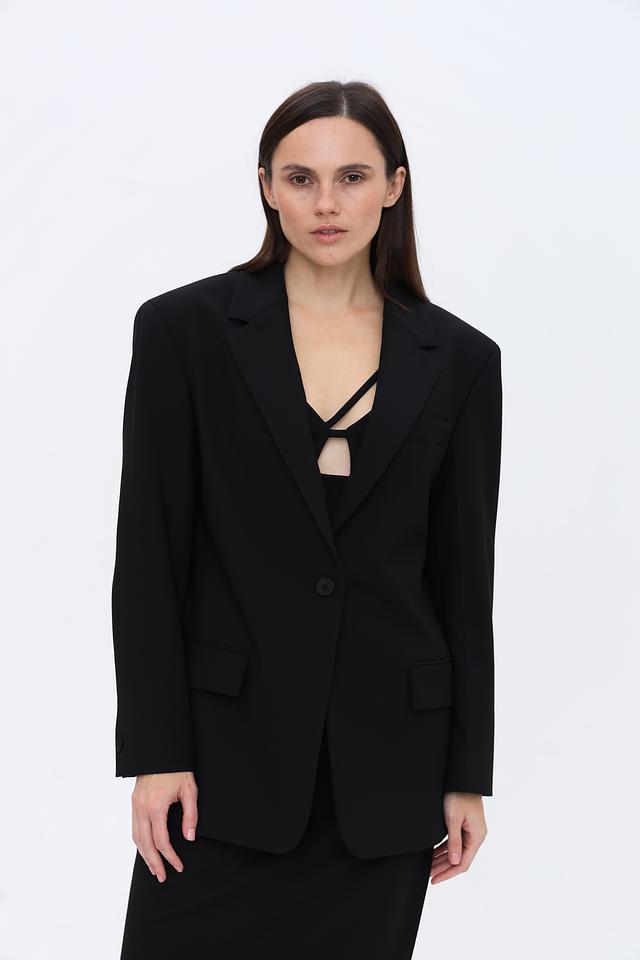 Особенности кроя включают в себя прямой силуэт, лацканы, застежку на одну пуговицу и длинные рукава. Жакет имеет прорезные карманы, которые добавляют функциональности и практичности. Благодаря оверсайз крою, жакет отлично смотрится с платьями, юбками и брюками.