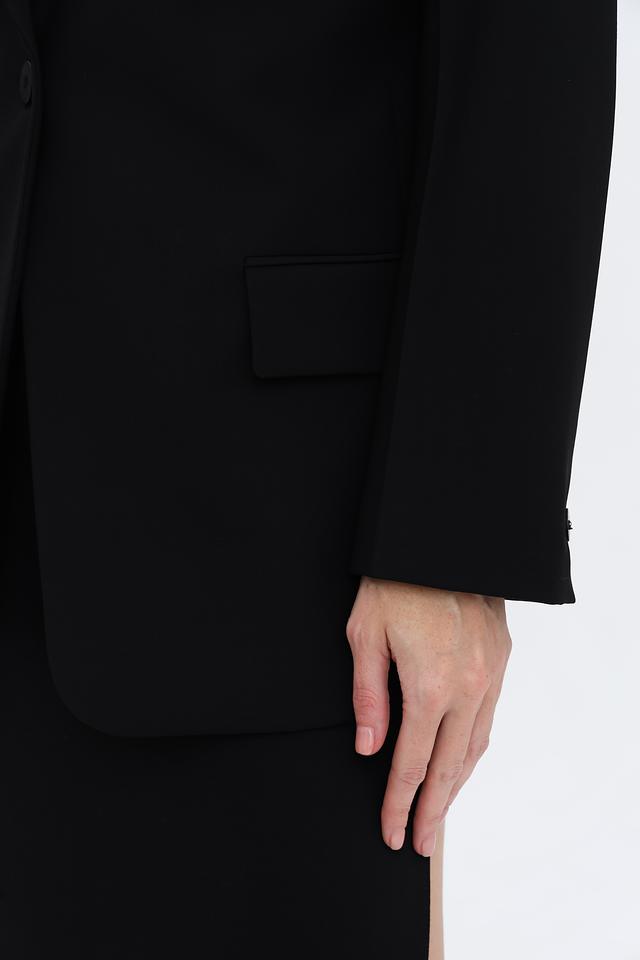 Жакет выполнен из высококачественного материала, состоящего из полиэстера (64%), вискозы (31%) и эластана (5%). Это сочетание обеспечивает приятные тактильные ощущения, хорошую посадку по фигуре и устойчивость к сминанию.