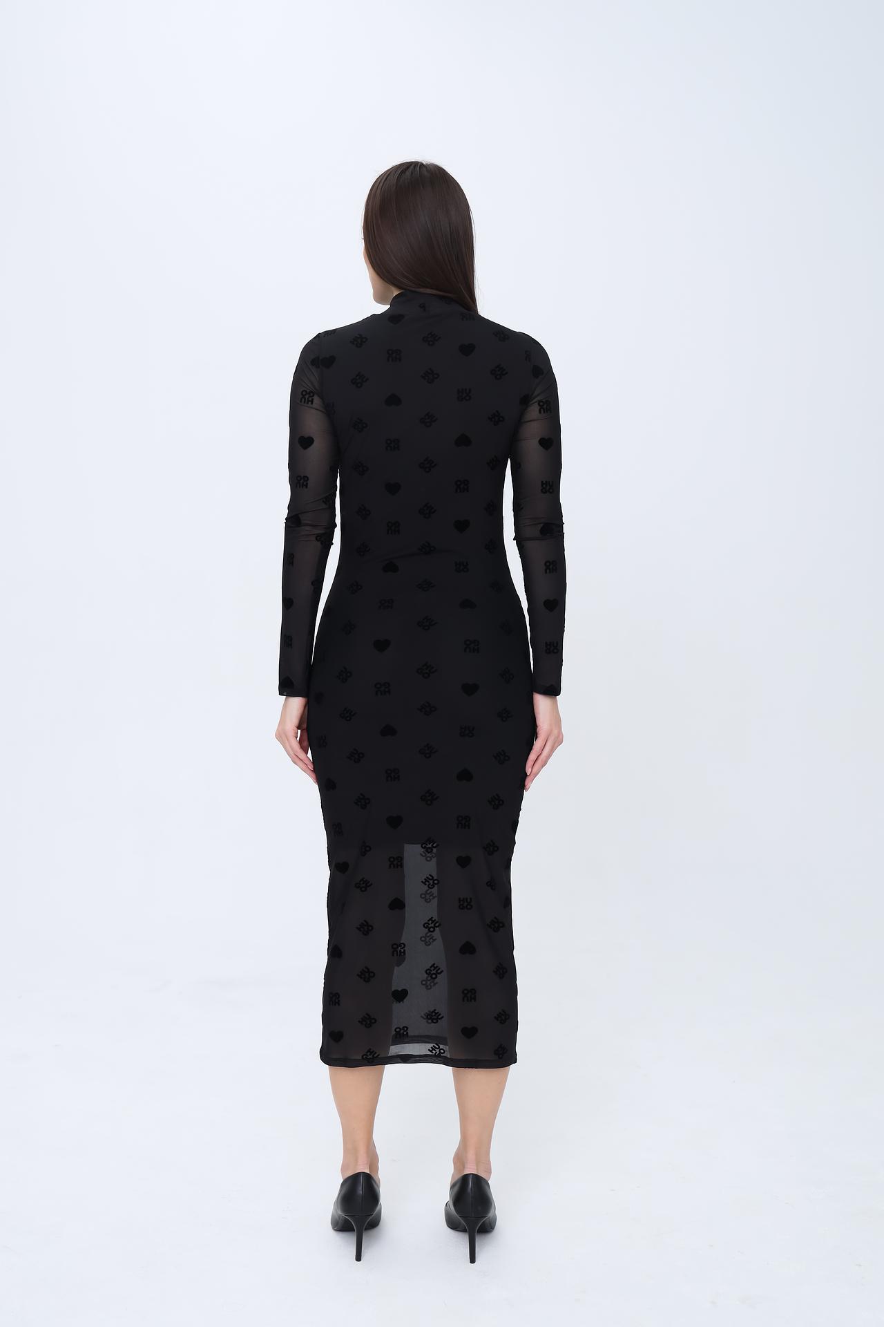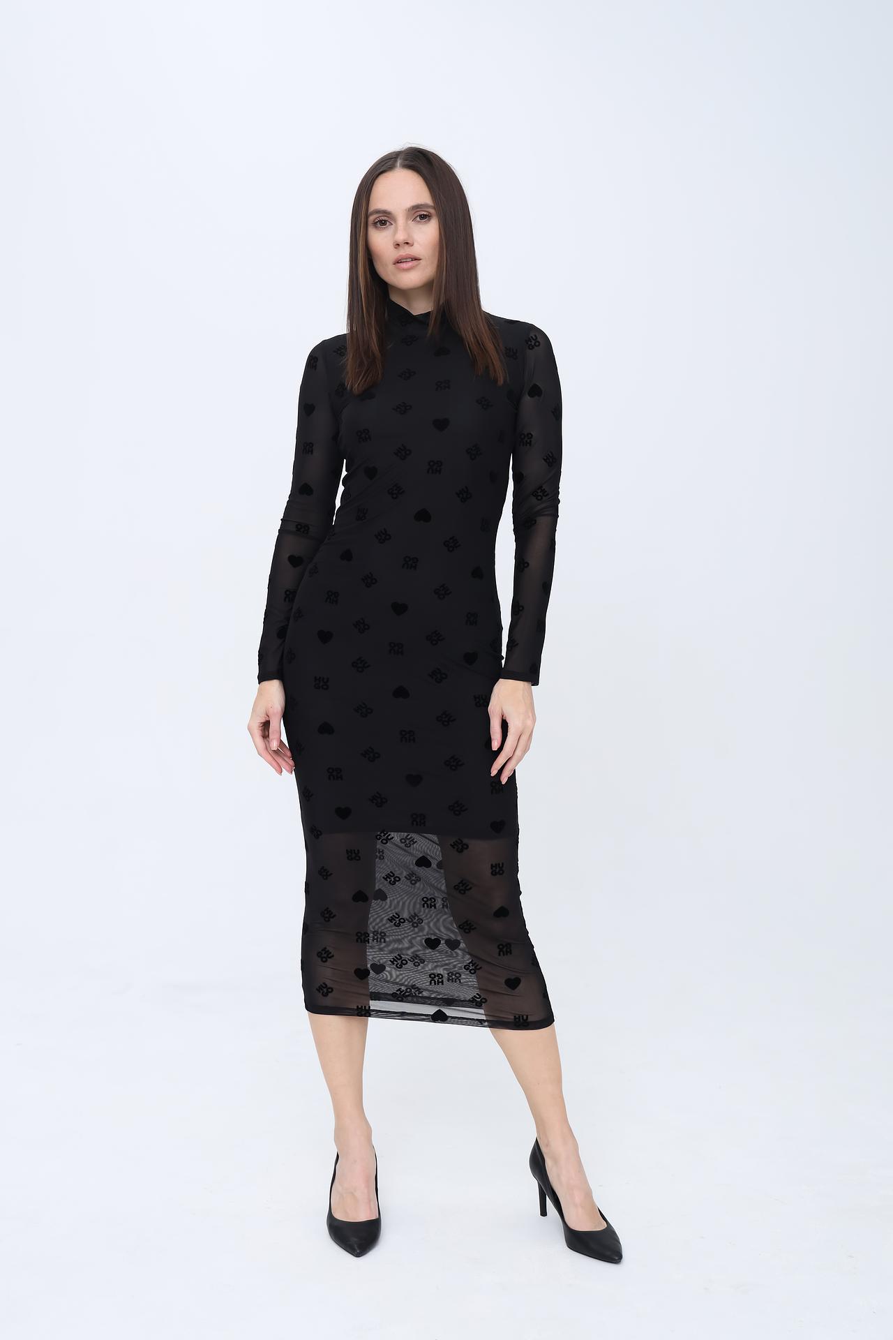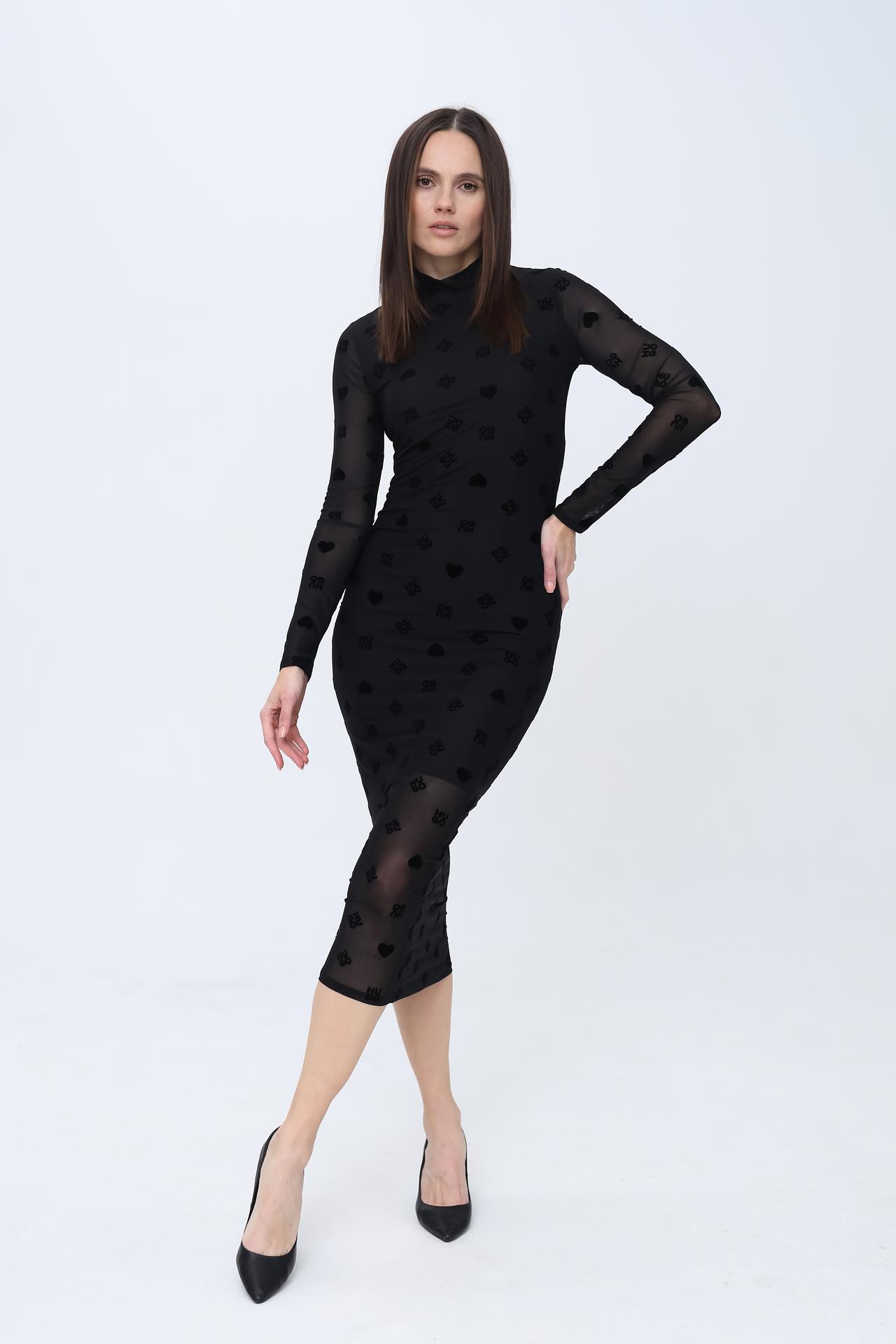 Платье миди с облегающим силуэтом подчёркивает достоинства фигуры.