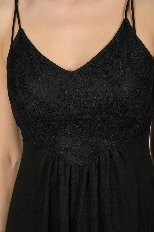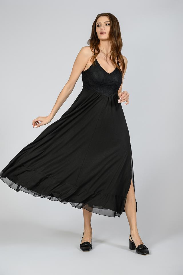 Верх платья выполнен из изящного кружева, которое придает ему особую женственность и изысканность. Юбка платья выполнена из лёгкой и струящейся ткани, что обеспечивает комфорт и свободу движений.