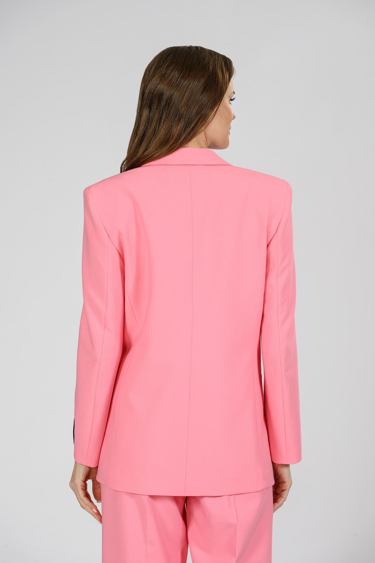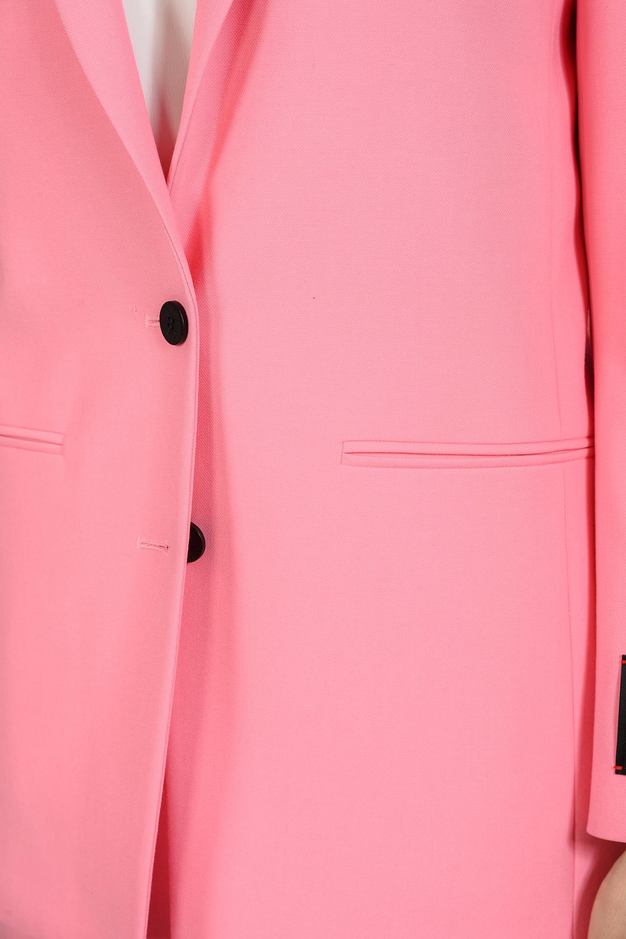 - Цвет и дизайн: Выразительный розовый оттенок придает жакету свежесть и индивидуальность, делая его заметным акцентом в любом ансамбле. Классический однобортный крой с элегантными лацканами и двумя пуговицами создает строгий, но при этом женственный образ.