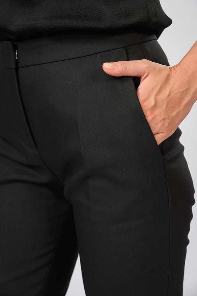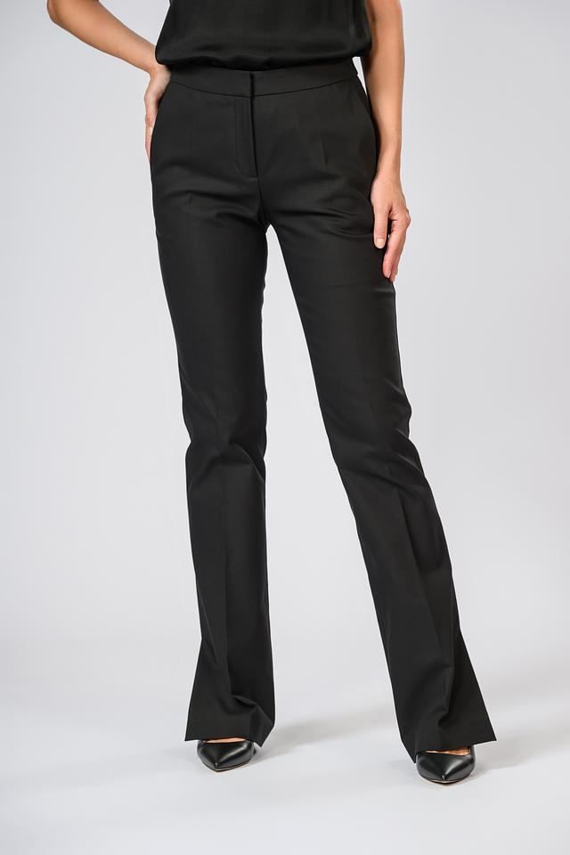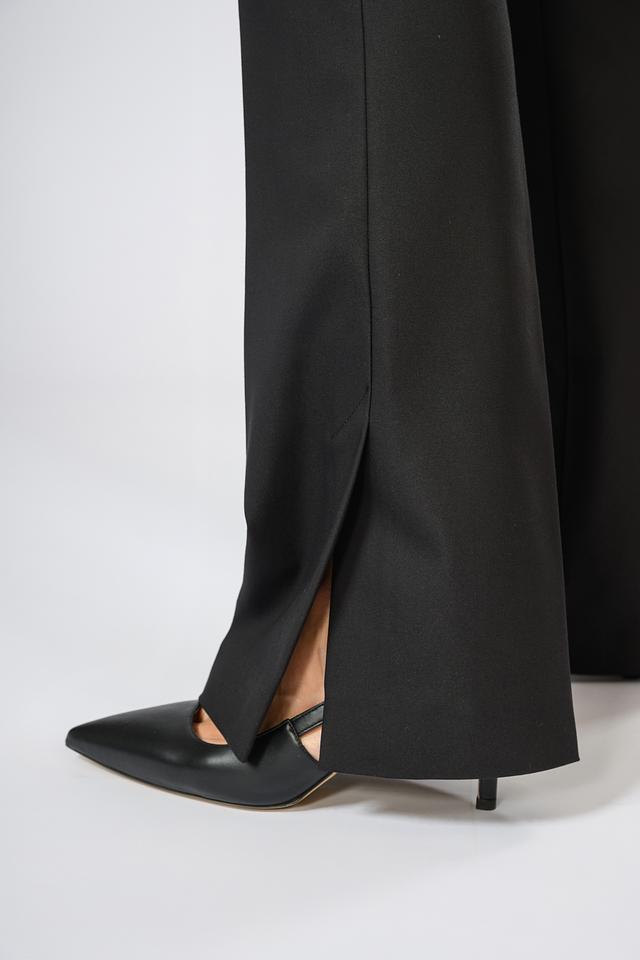 Брюки имеют прямой крой, который подчеркивает фигуру, не сковывая движений. Отличительной особенностью являются разрезы по низу штанин, добавляющие образу современный акцент.