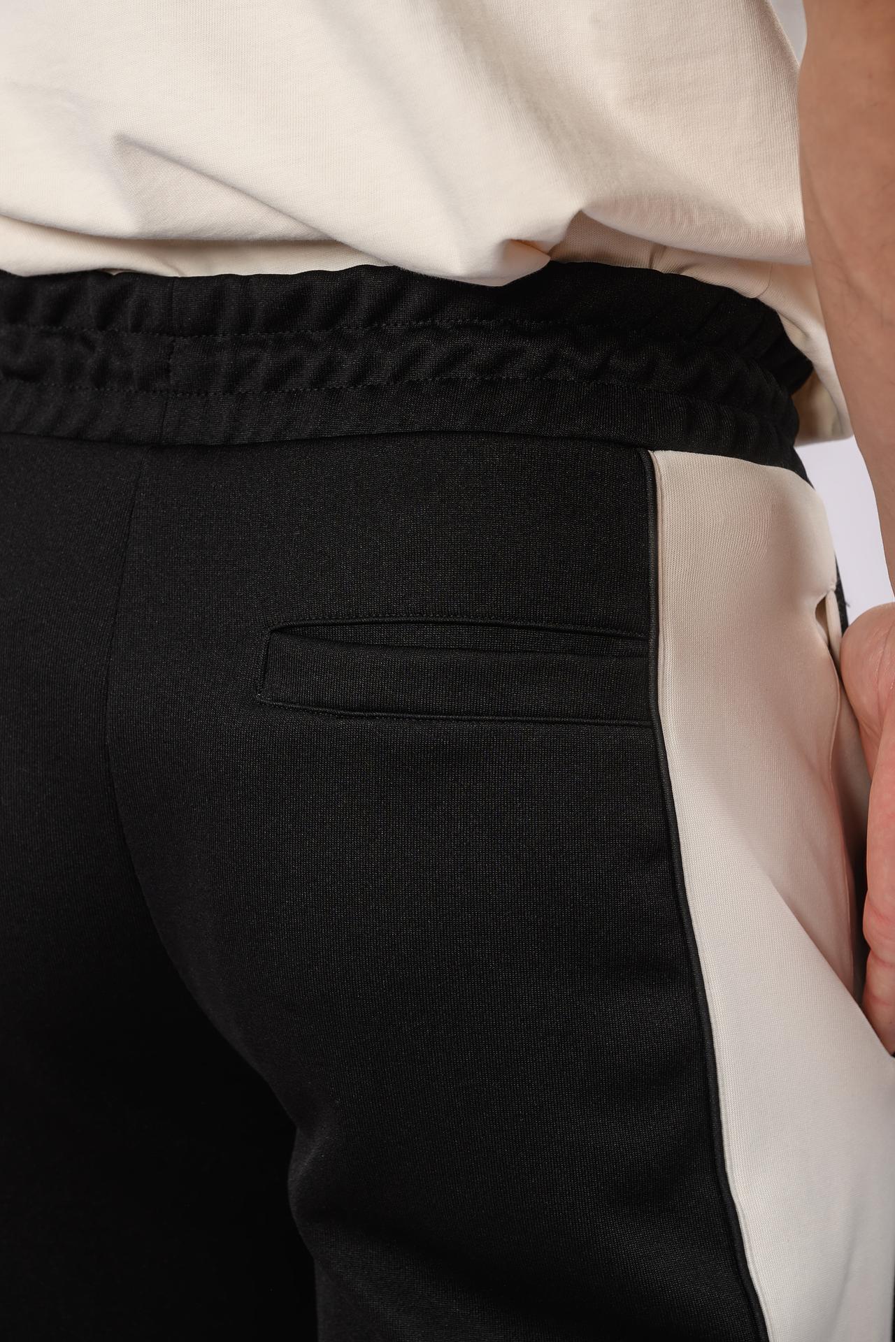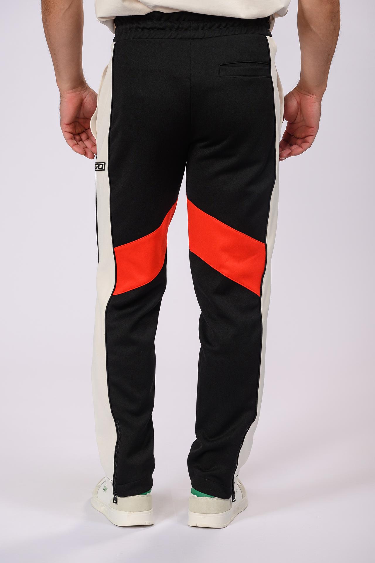 - Дизайн: Оригинальный дизайн с геометрическими вставками в оранжевом цвете и боковыми бежевыми полосами придает брюкам уникальность. Контрастное сочетание цветов подчеркивает спортивный стиль.